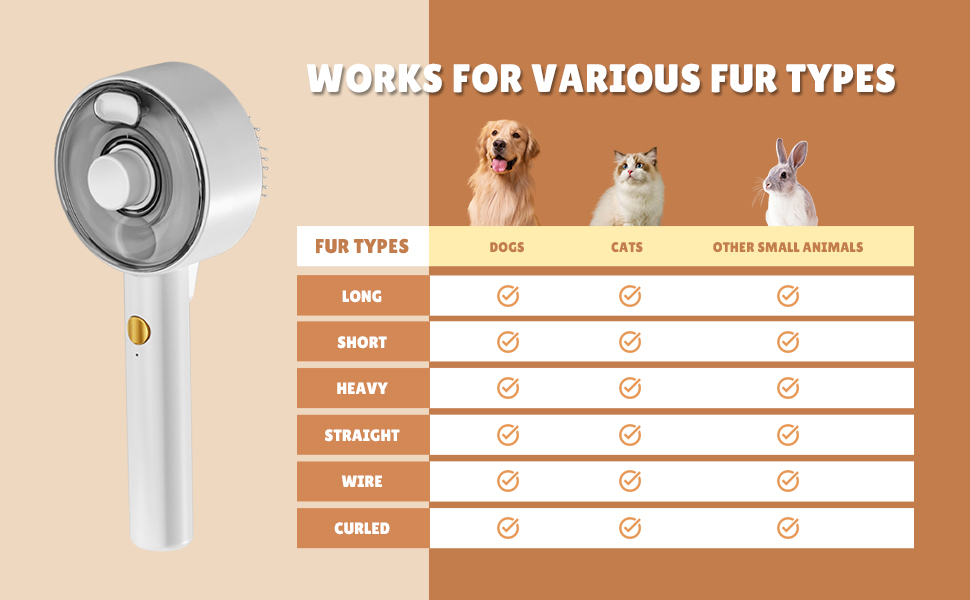 【Adjustable Dual Spray Modes & One-Click Hair Removal】Featuring two adjustable spray modes, this steam cat brush allows you to choose the mist intensity based on your pet’s fur type. A long press activates the purple light, aiding in thorough cleaning. The fine mist helps manage pet hair, and the one-click hair removal button ensures easy cleanup after grooming. This cat deshedding brush is perfect for maintaining a tidy, healthy coat with minimal effort.
