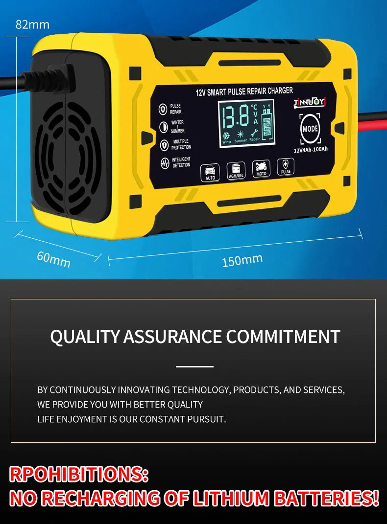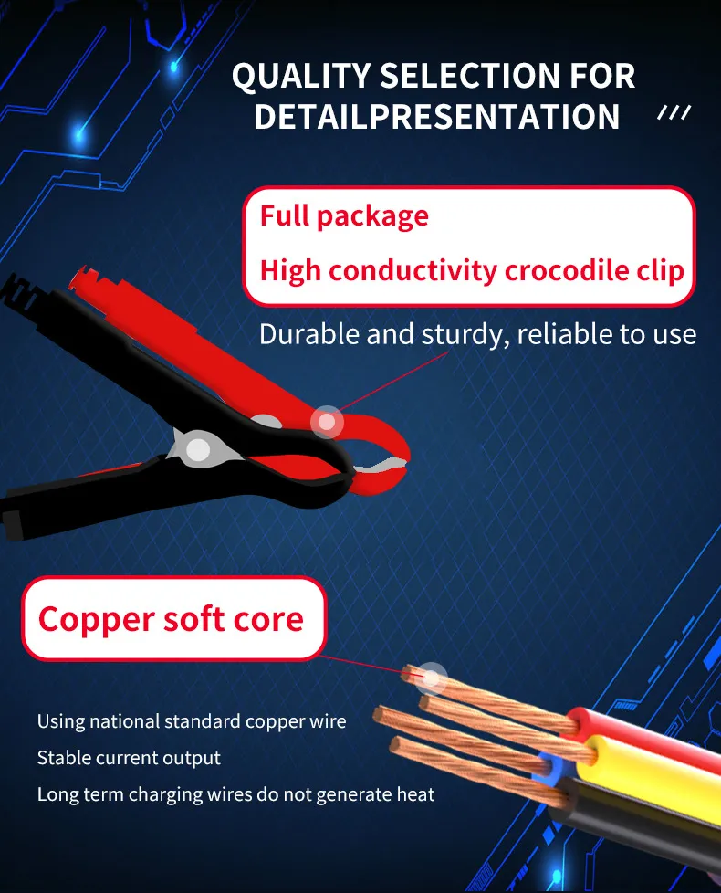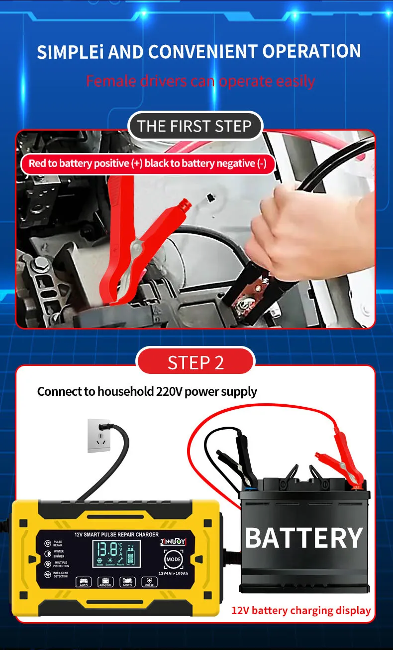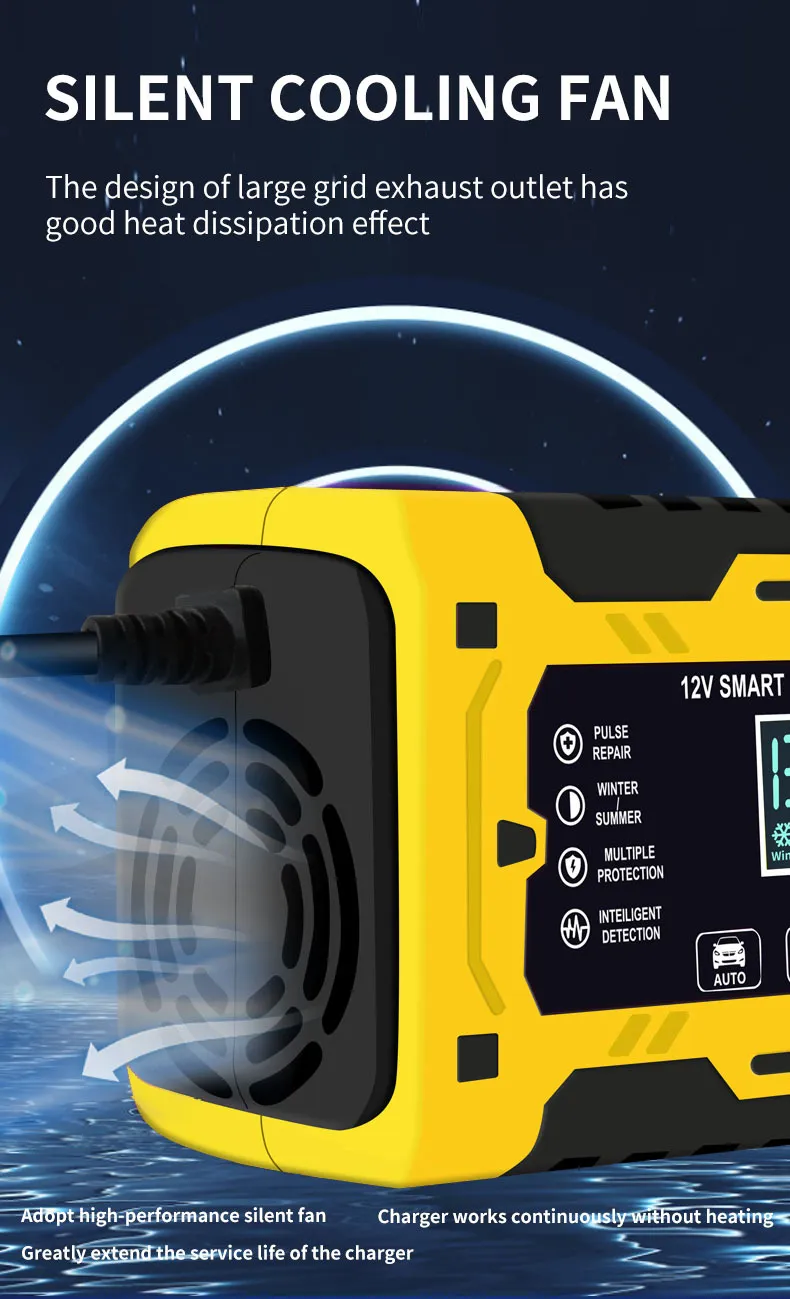 In conclusion, the 12V Car Battery Charger is a must-have for every car owner. It provides fast and efficient charging while offering advanced safety features such as automatic shutoff and reverse polarity protection. Whether you're using it at home, in the garage, or taking it with you on road trips, this charger is designed to make your life easier and ensure your car’s battery stays in excellent condition. Never worry about a dead battery again with the 12V Car Battery Charger.