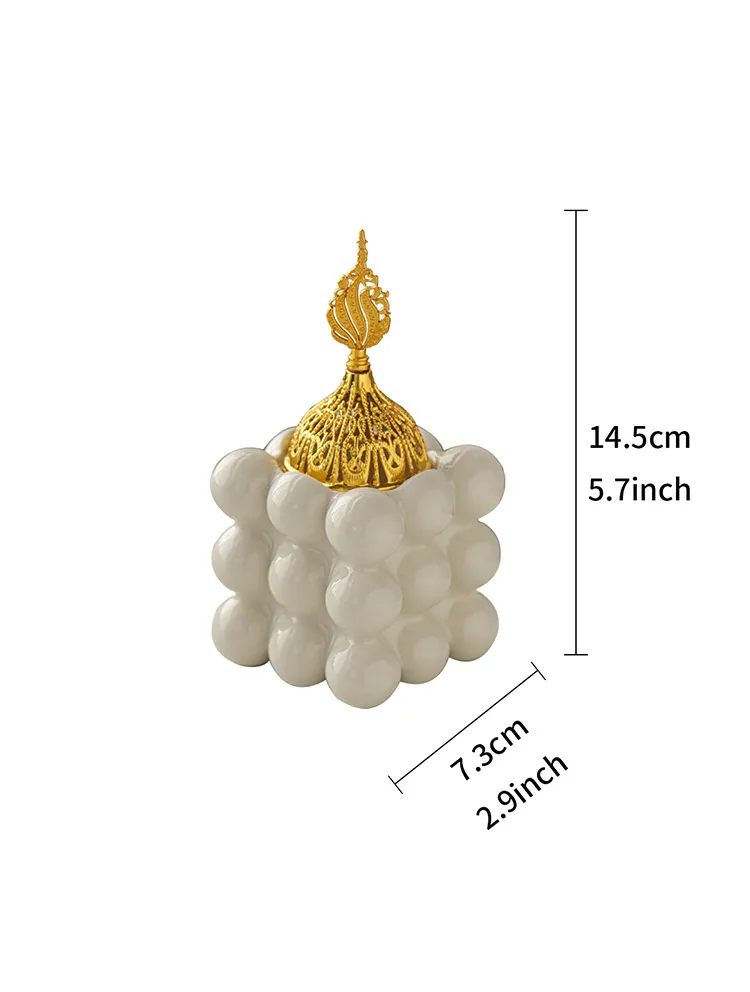 Add a touch of elegance and cultural charm to your space with the Ceramic Golden Rubik's Cube Incense Burner. This exquisite piece blends the traditional allure of incense burning with a modern, artistic design, perfect for homes, offices, or festivals. Inspired by the Middle Eastern Arab festival style, this incense burner features a unique Rubik's Cube design, highlighted with a luxurious golden finish, making it both a functional and decorative piece for any occasion.