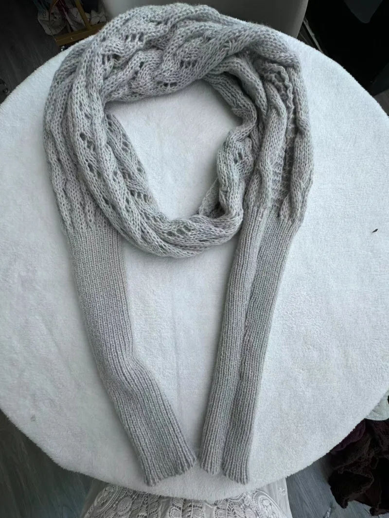 - Material: La bufanda suéter con mangas se teje con dos agujas utilizando una puntada calada que simula picos y trenzas en la parte superior e inferior, con una lana vegana compuesta de fibra extremadamente suave.