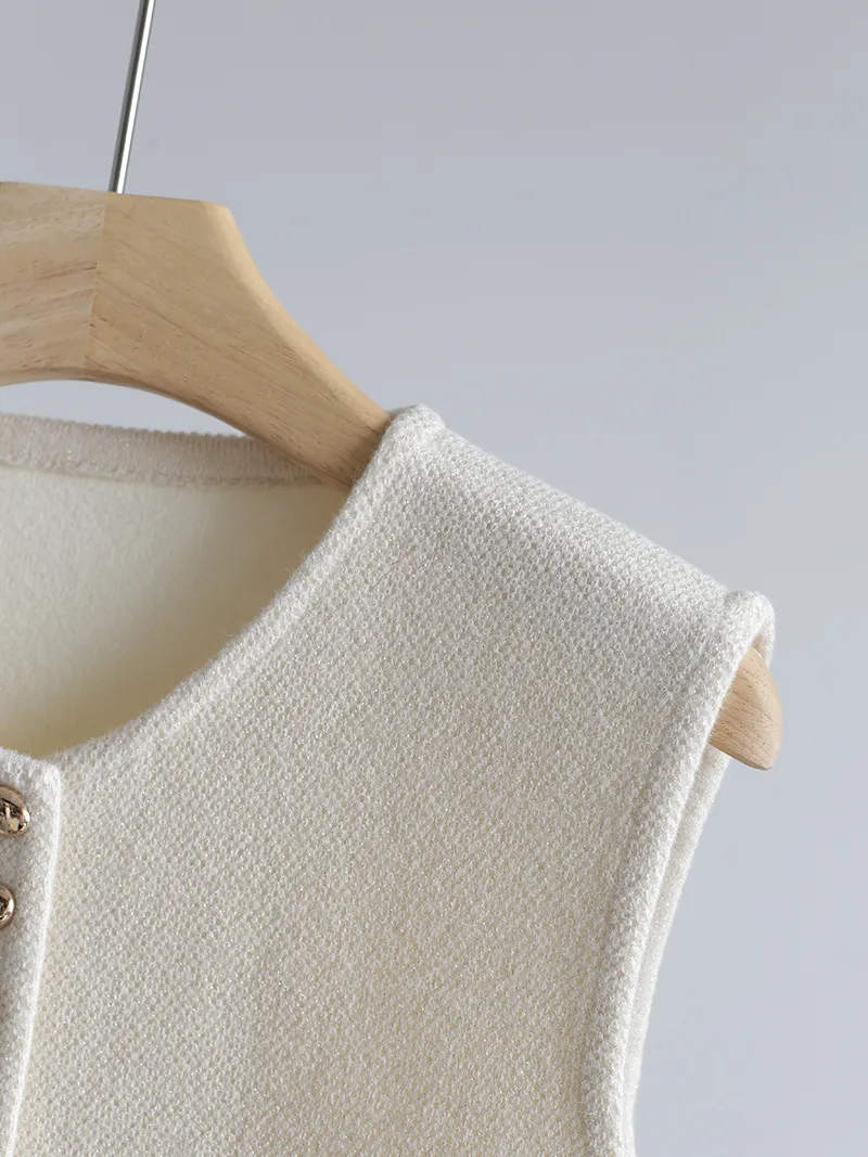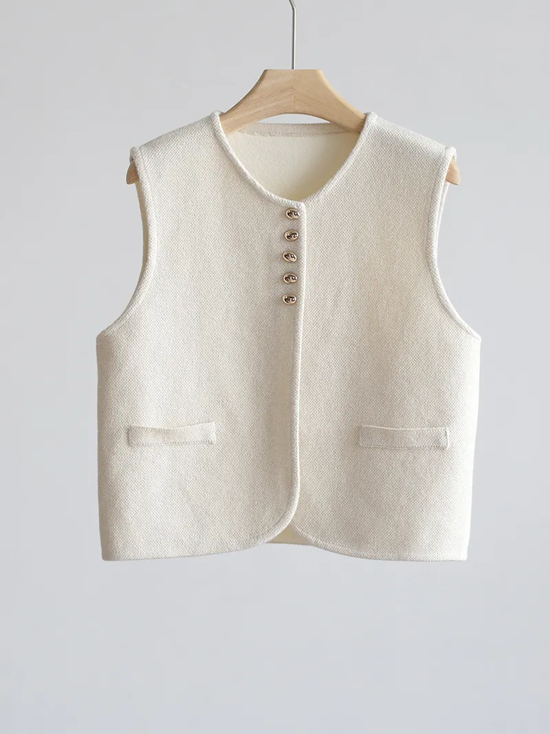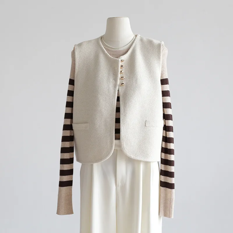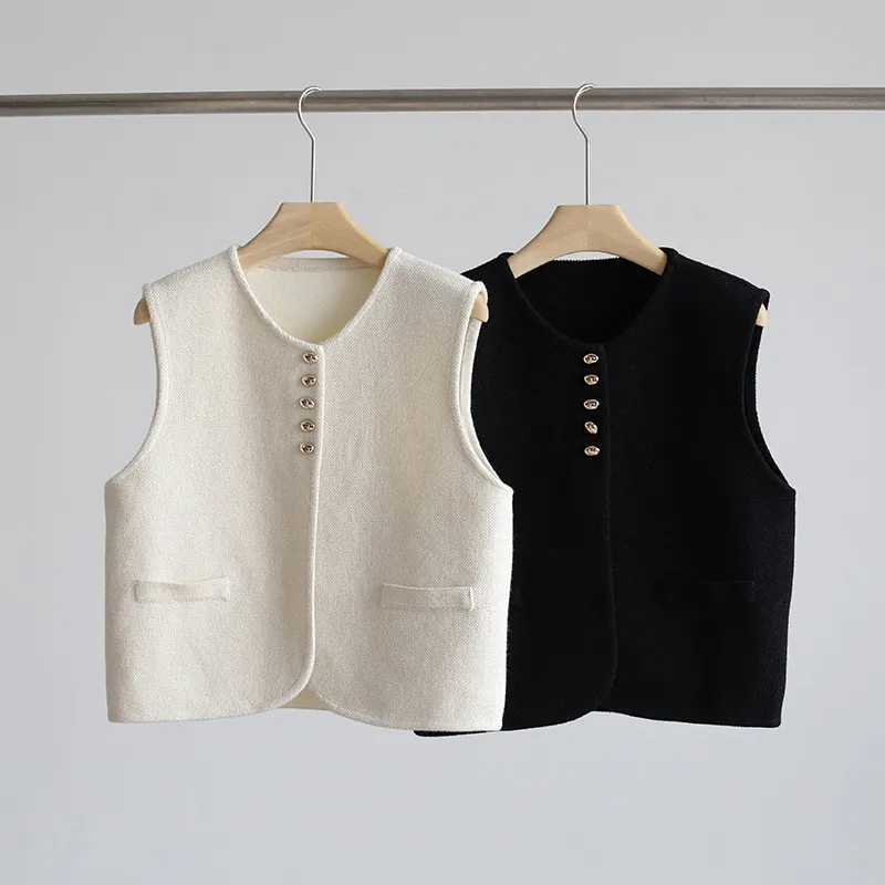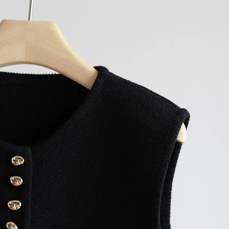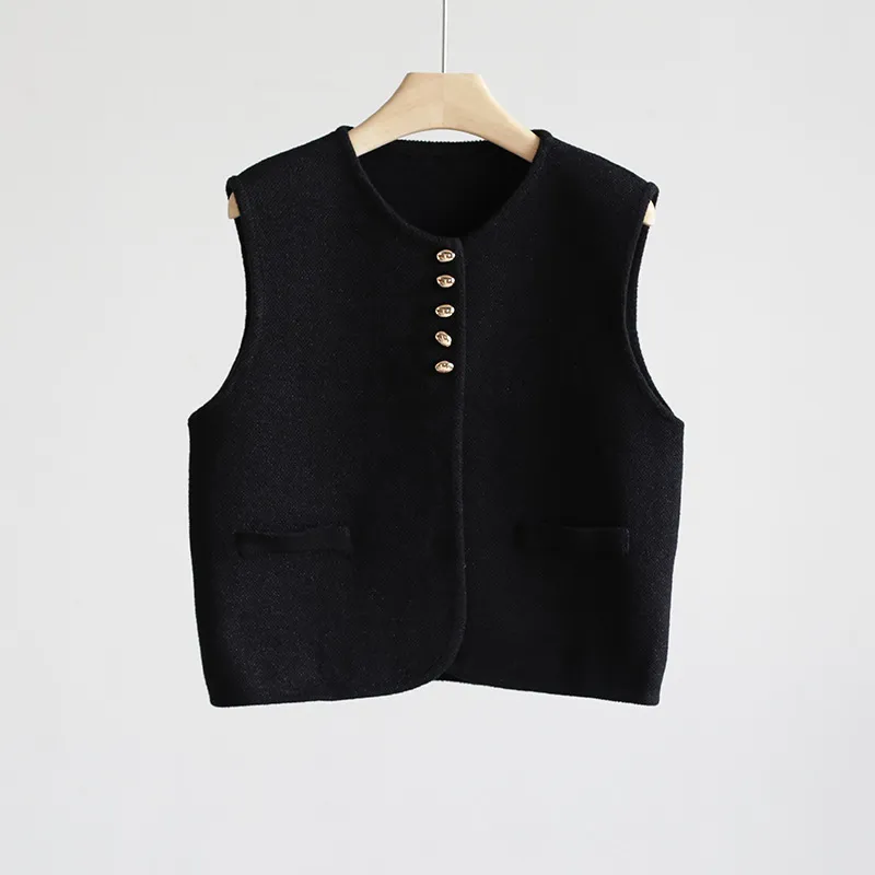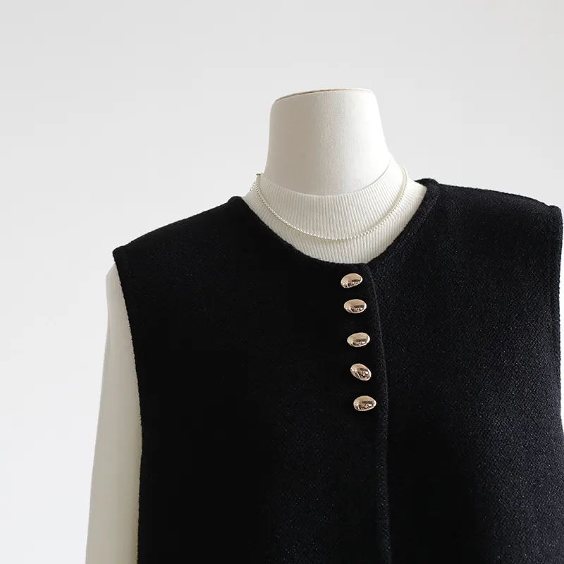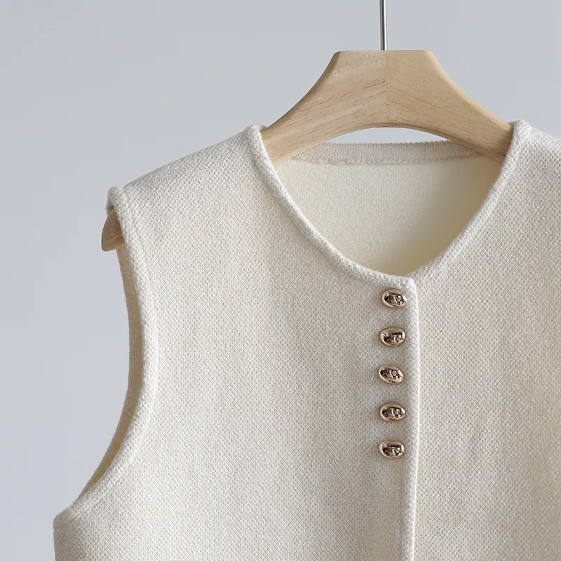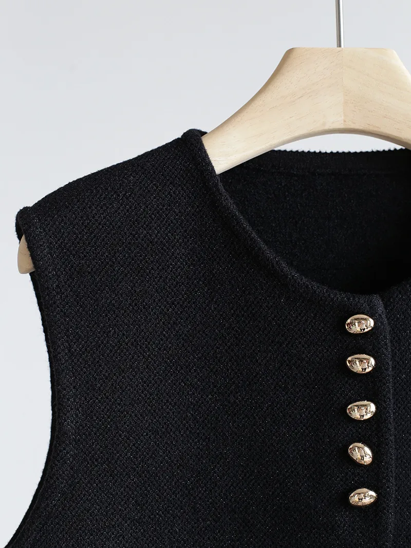 Chaleco de punto de lujo estático con cuello redondo y hebilla dorada estilo Old Money