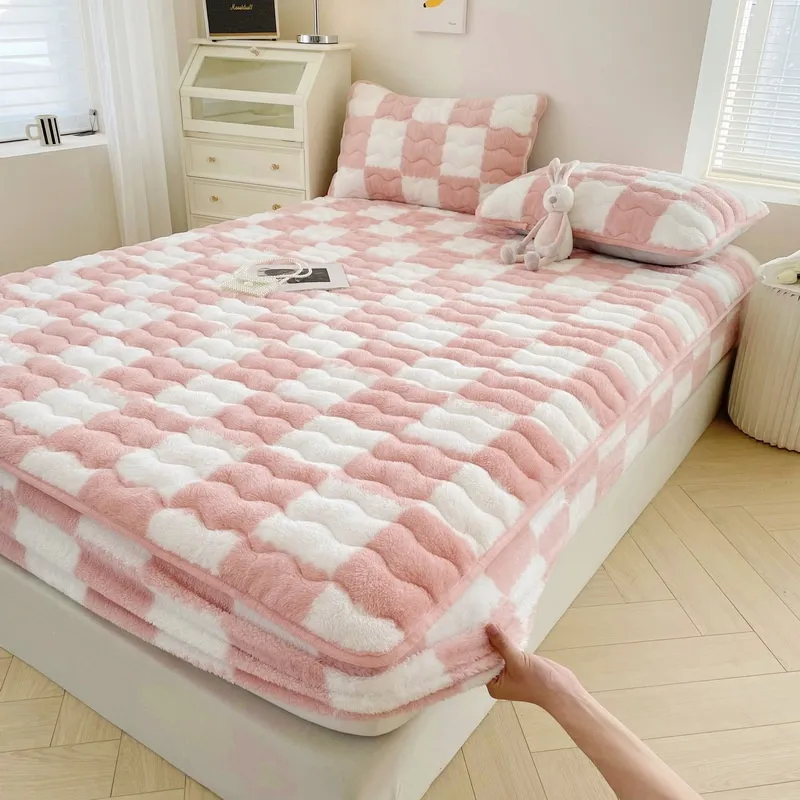 Checkerboard Warm Plush Mattress Cover – Cozy Insulated Comfort with Stylish Texture