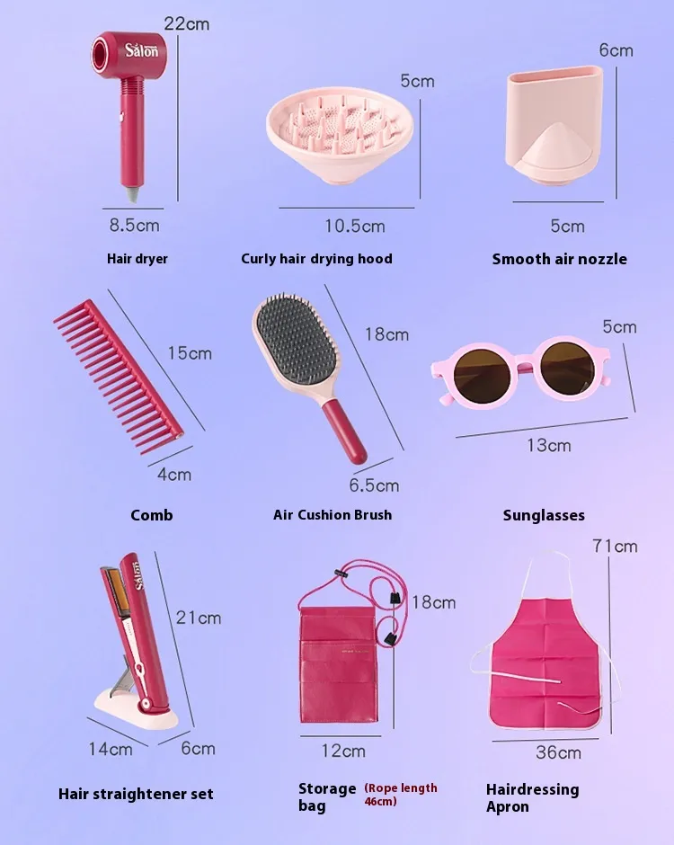 The Children Play House Hair Salon Suit Toys provides more than just fun; it also helps kids develop important skills. Through imaginative play, children can enhance their creativity and critical thinking. By pretending to be a hairstylist, your child will create various hairstyles, experiment with color and styles, and practice problem-solving skills.