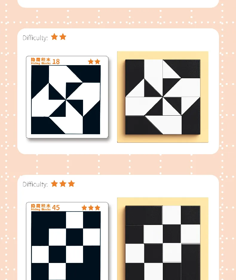 - Complete Package: The set includes 1 jigsaw puzzle tray, 4 white triangles, 4 black triangles, 4 white trapezoids, 4 black trapezoids, a booklet with 120 challenges, and a storage bag. Lightweight and compact, it’s easy to carry around and play with, providing endless entertainment and educational opportunities