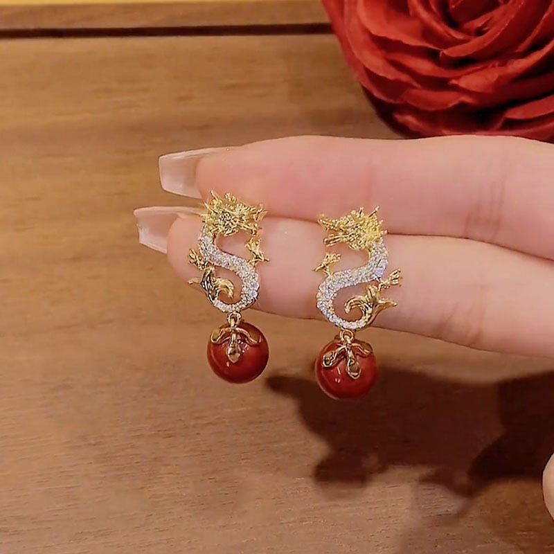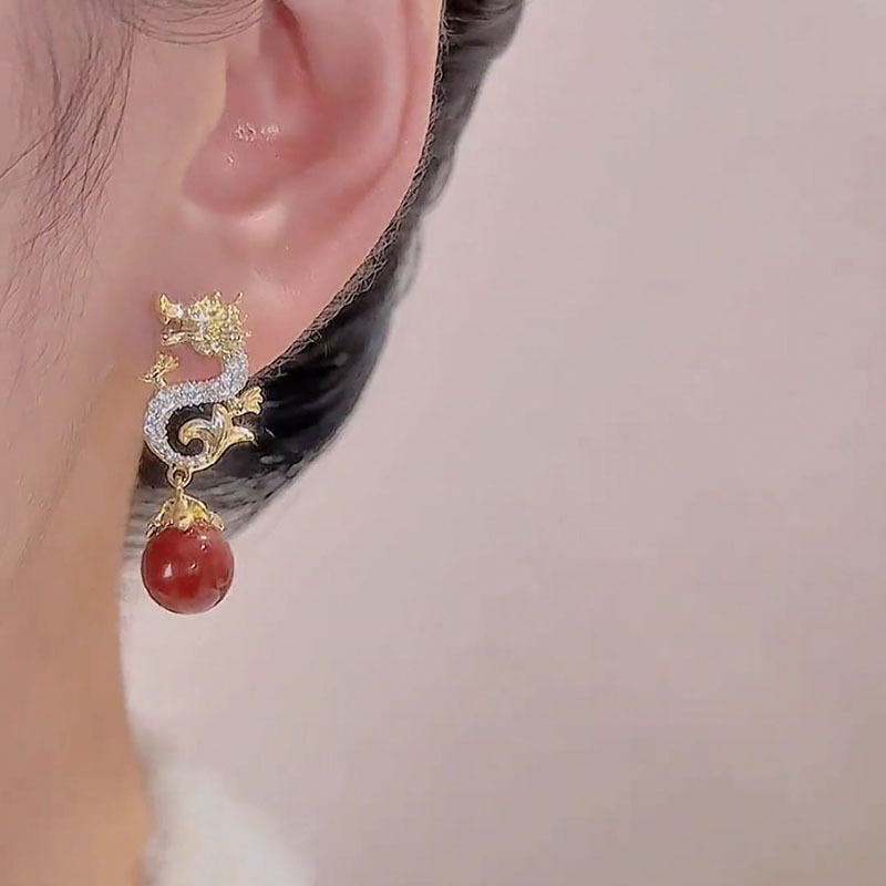 How to Wear the Chinese Style Festive New Year Red Beads Zodiac Dragon Stud Earrings