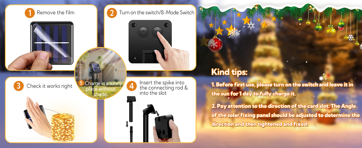- The outdoor solar string lights are sensitive to light, please do not install them in such an environment where will be very bright at night.