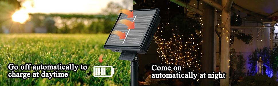 The solar panels can effectively absorb sunlight,lights will work more than 8 hours if its fully charged. Light sensor feature enables it automatically turn off at dawn and turn on at dusk.