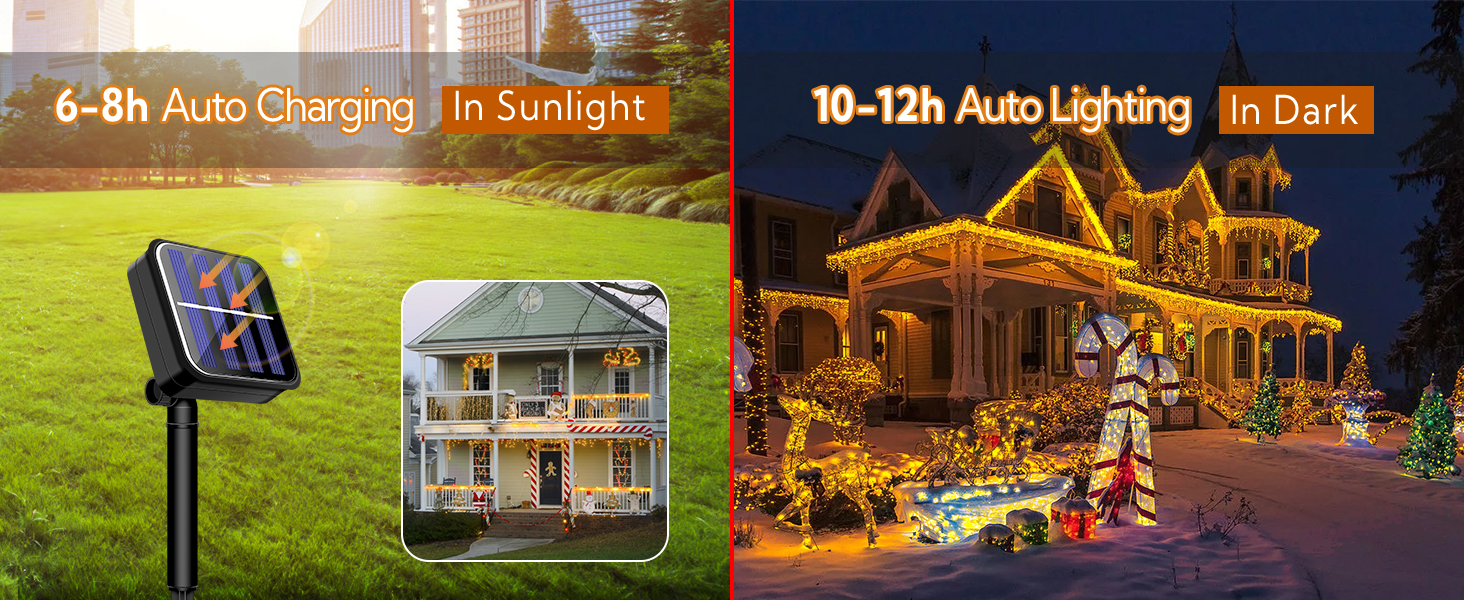 - 【High Efficiency Solar Charging】Equipped with a powerful 800mAh nickel-metal hydride battery and high efficiency solar panels, solar christmas lights outdoor can be fully charged in direct sunlight with a charging time of 6–8 hours. Once fully charged, it can provide up to 10–12 hours of continuous lighting throughout the night.