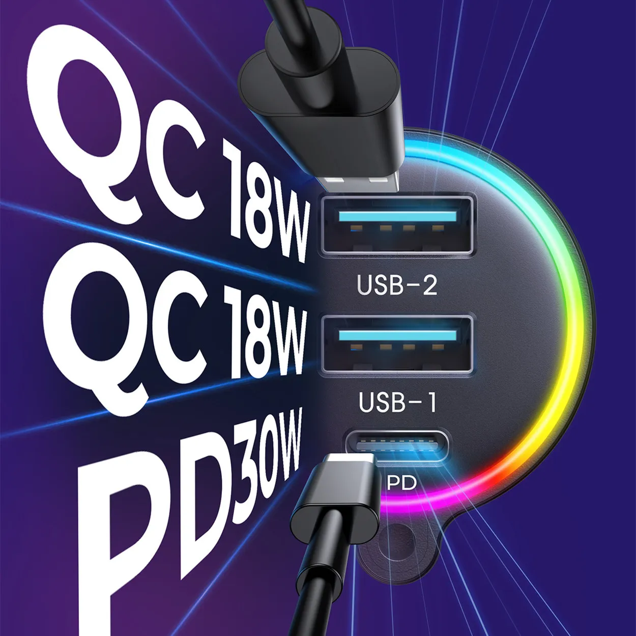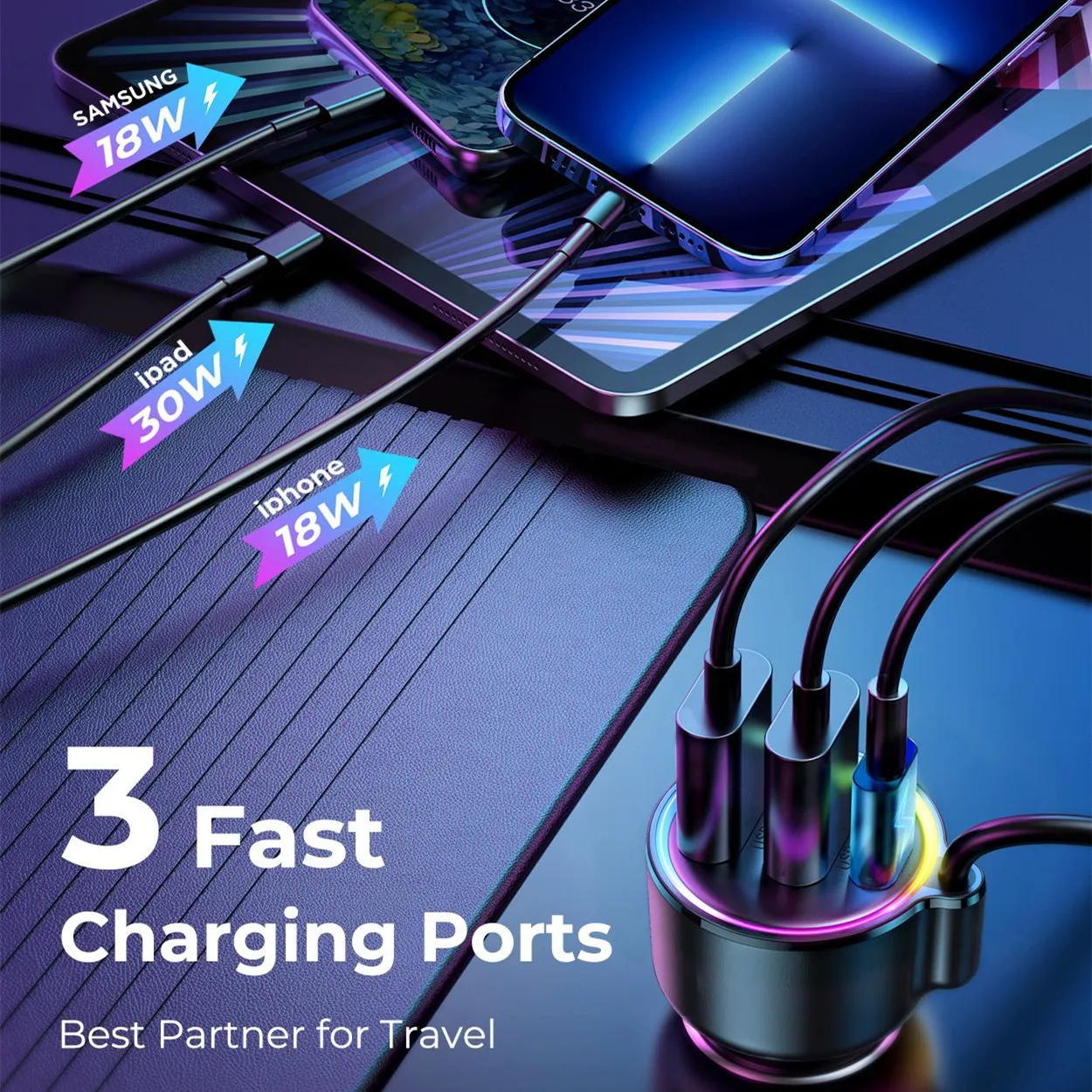 2. With two QC3.0 and one PD30W fast charging interface, support three devices charging at the same time