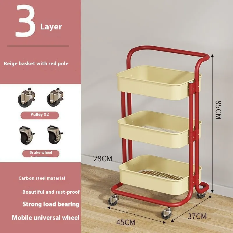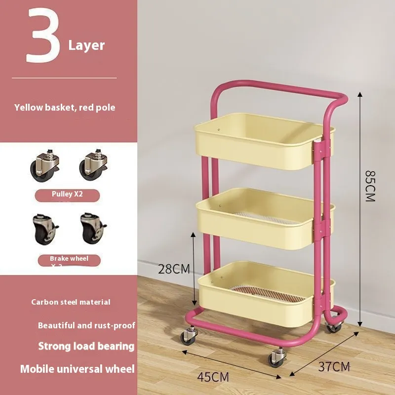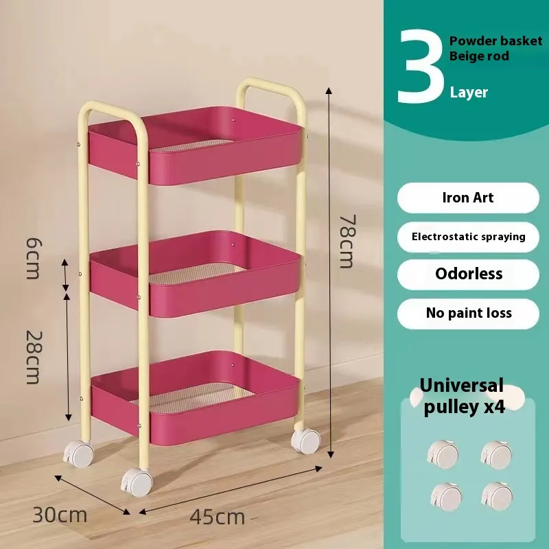 carbon steel beige basket red Rod trolley, 3-layer carbon steel beige basket pitaya powder rod hand push, 3-layer pink carbon steel White