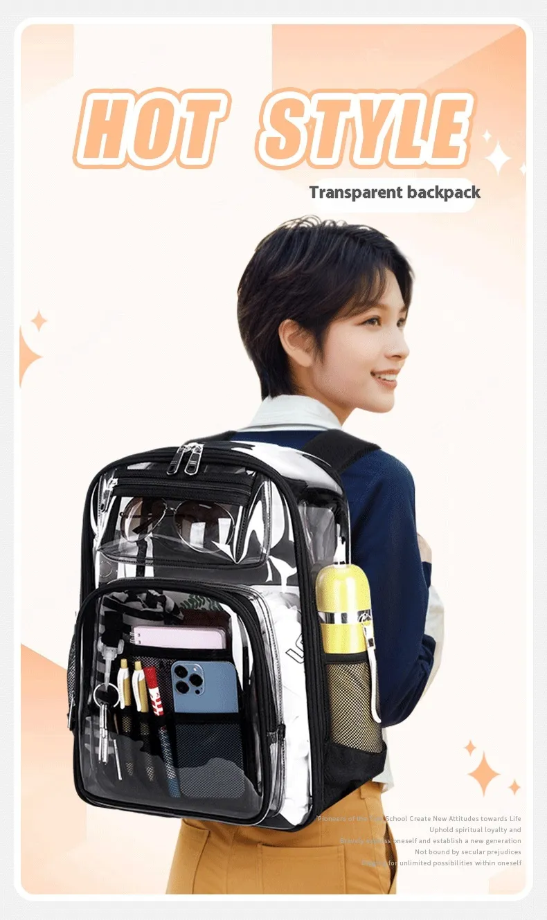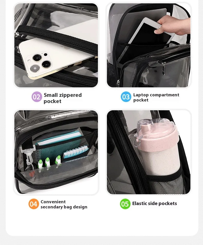 While clear backpacks are known for their practicality, they don’t sacrifice style. Many clear backpacks come in sleek, modern designs with contrasting colored straps, zip closures, and even decorative elements like patches or logos. This means you can express your style while enjoying the benefits of a transparent, functional bag.