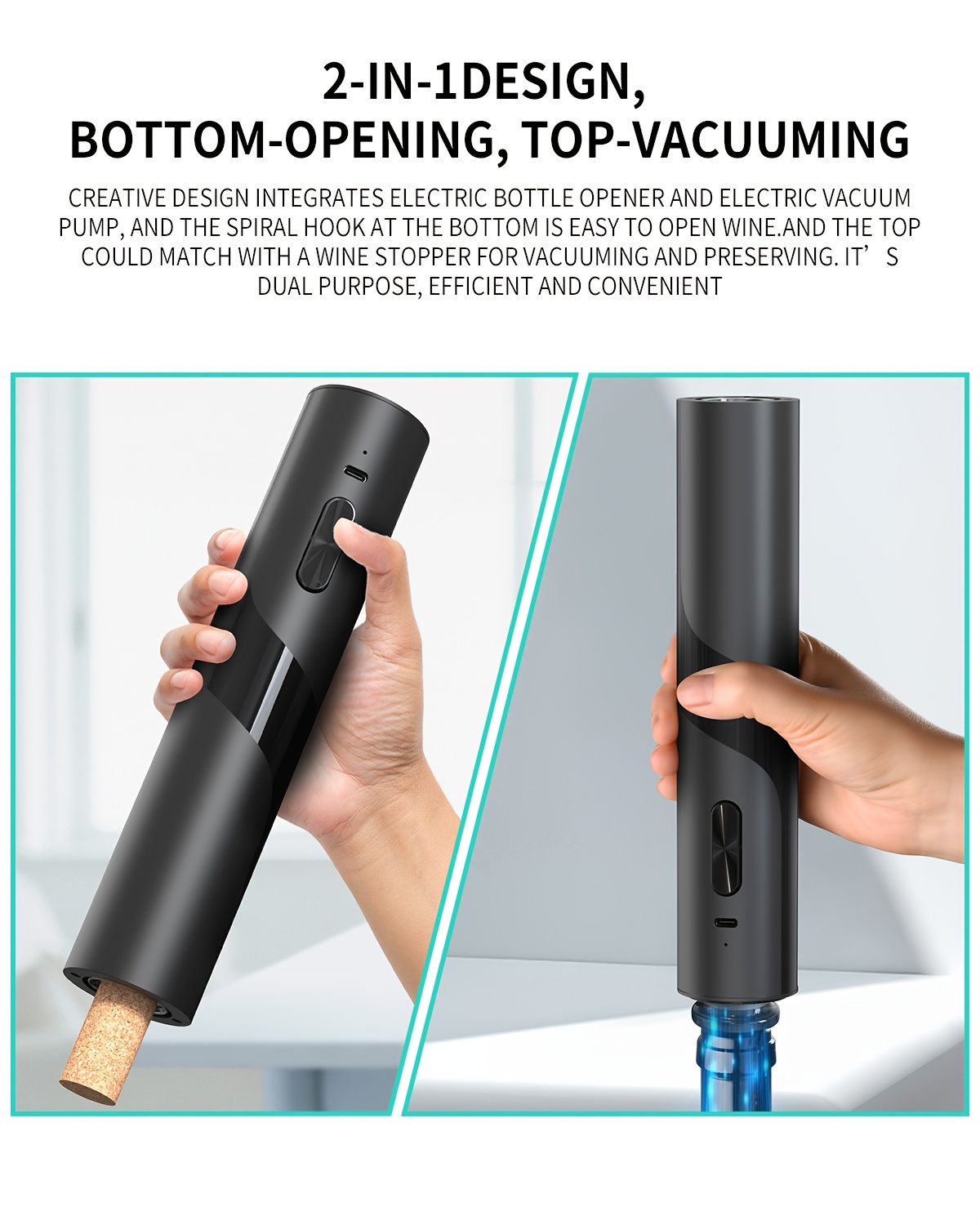 - Electric Wine Opener: The electric wine opener effortlessly removes corks with the push of a button, making it quick and easy to open wine bottles without the hassle of manual corkscrews.