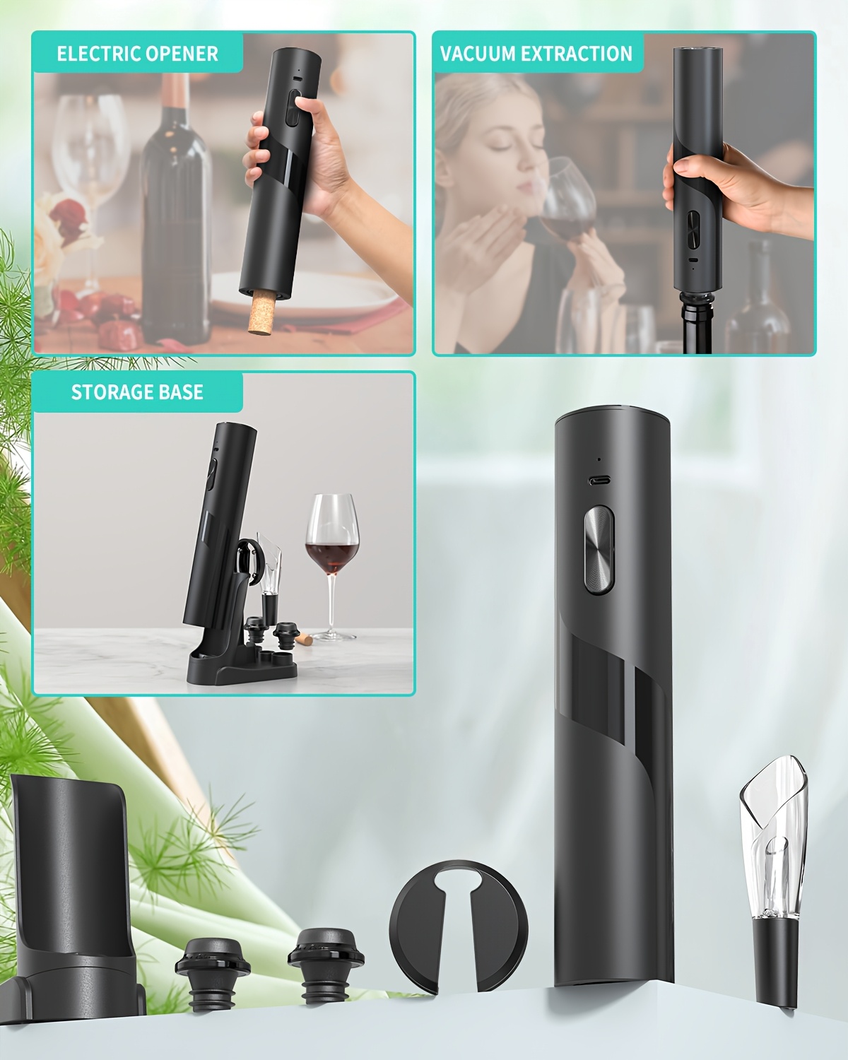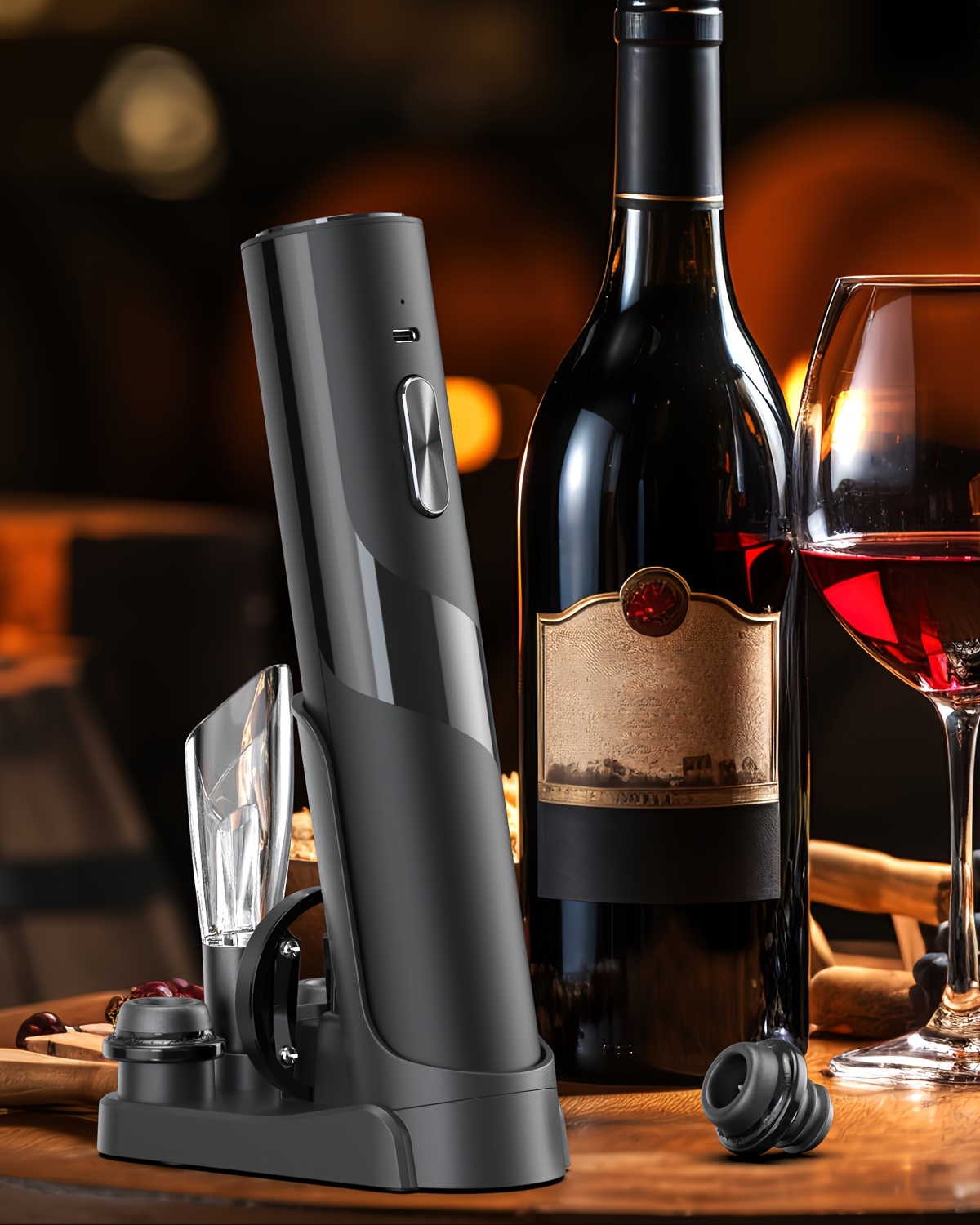 - 7-in-1 All-In-One Set: The set includes an electric wine opener, electric vacuum pump, charging station, foil cutter, wine aerator pourer, and two wine glasses, providing everything you need to open, preserve, and serve wine.