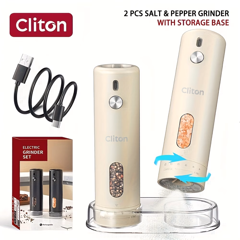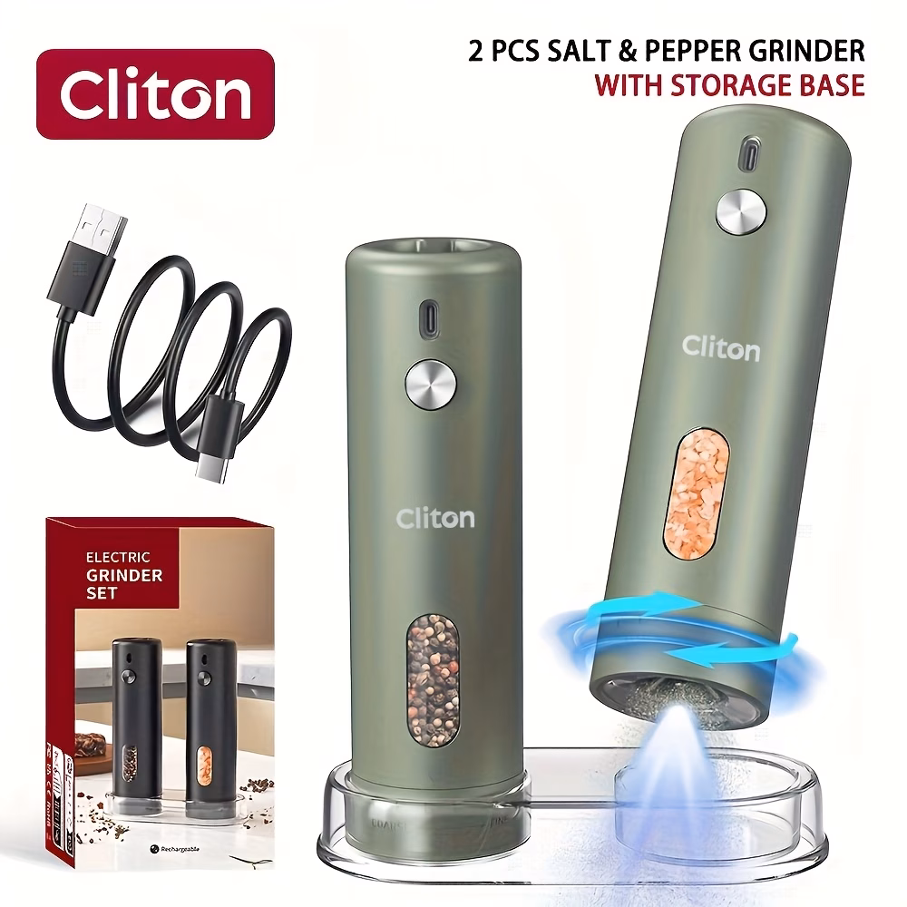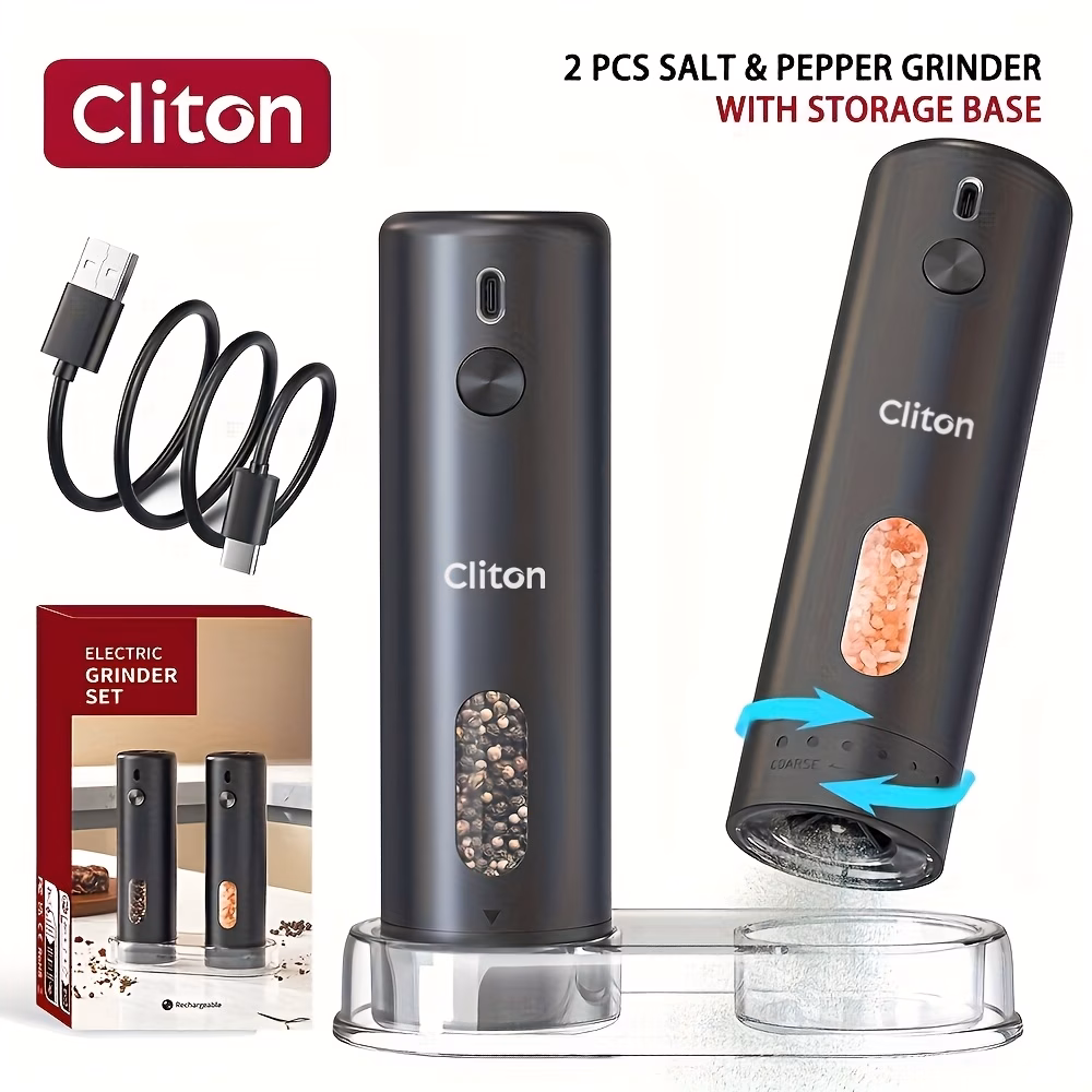 The CLITON Electric Pepper Grinder Rechargeable is a convenient and efficient solution for grinding pepper and salt, featuring automatic operation, adjustable coarseness, and a sleek, modern design. Whether you're cooking at home or grilling outdoors, this automatic salt and pepper mill set is perfect for providing freshly ground spices with ease. With its one-handed operation, USB rechargeable battery, and LED light, this grinder makes seasoning your meals simpler and more precise, making it an ideal choice for any kitchen or outdoor dining setup.