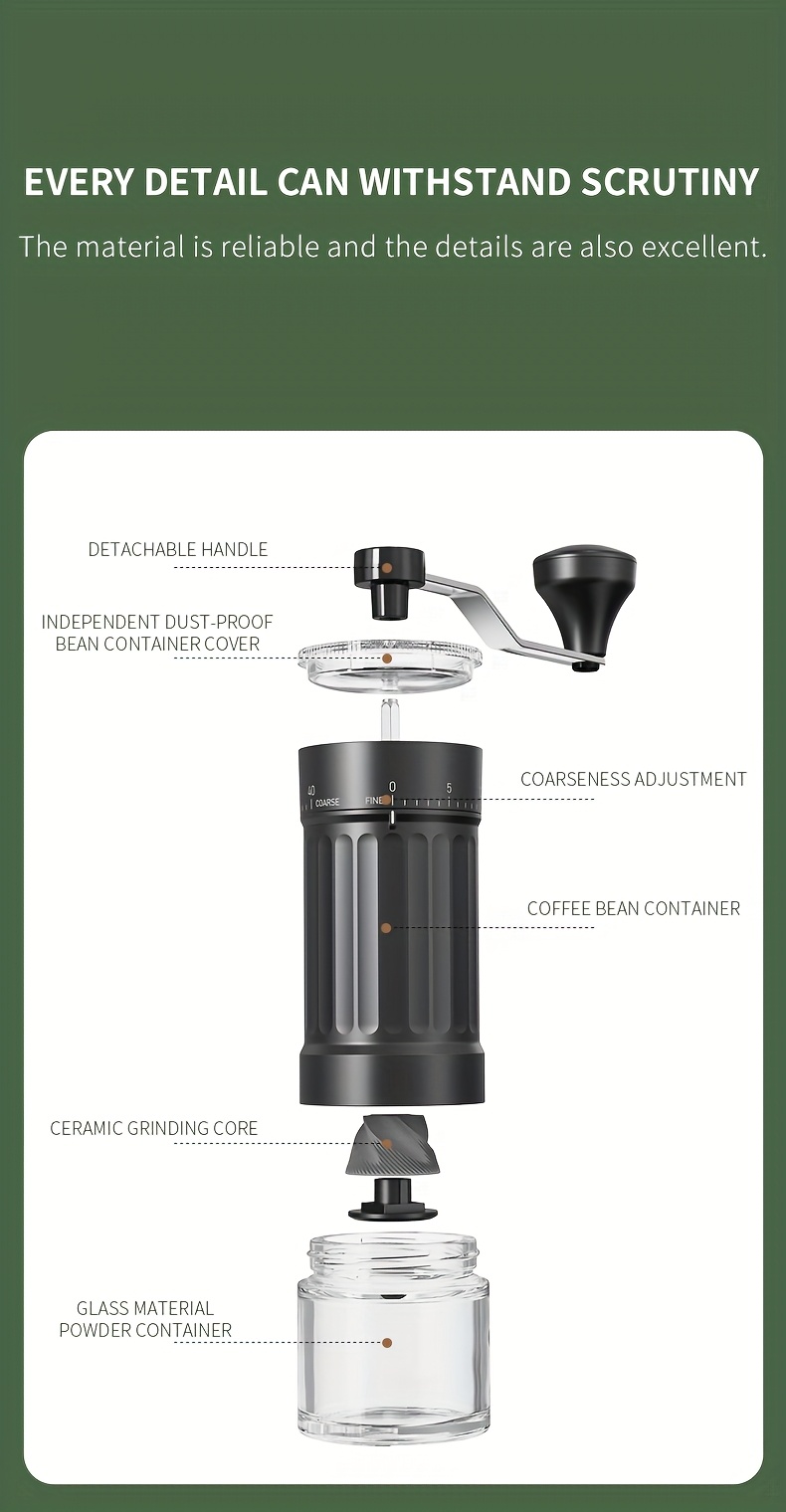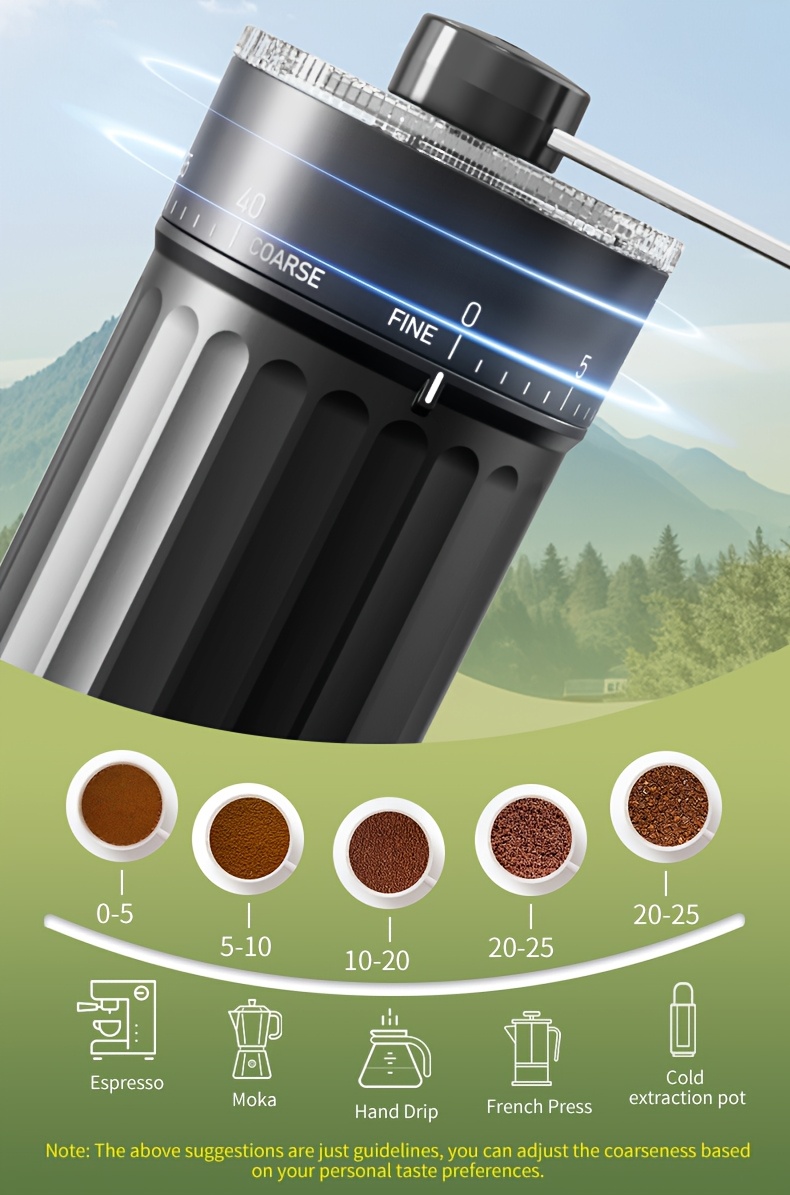 extended stainless steel handle reduces the effort needed when grinding beans. 6. The handle can be removed for easy transport.7. External adjuster, simple and convenient without coming into contact with the ground coffee.CLITON Manual Coffee Grinder with 40 Adjustable Settings – Portable Cordless Conical Burr Grinder, 35g Capacity, Washable Container, Ideal for Aeropress, Espresso, Pour Over, French Press, Moka Pots, Durable Plastic