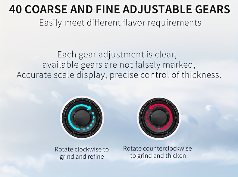 The CLITON Manual Coffee Grinder is designed to offer customizable grinding for various coffee brewing methods. With 40 adjustable settings, you can fine-tune the grind size from extra fine to coarse, perfect for everything from espresso to French press. The conical burr mechanism ensures a consistent grind while maintaining the natural oils and flavors of your coffee beans, providing the best possible brewing experience.