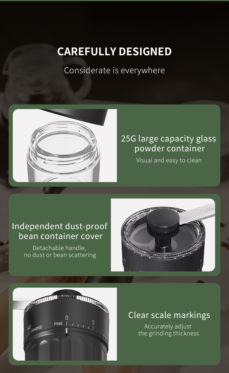2. You can set the grinding fineness precisely, allowing adjustments for any coffee type. 3. The transparent container for ground coffee