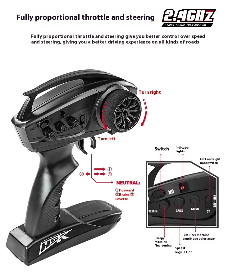 4. Sistema de control remoto síncrono de proporción completa de 2.4G Acelerador/dirección totalmente proporcional;