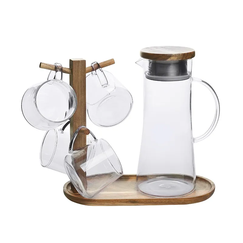 Color: glass cold kettle (can be heated by open flame), pot + 4 cups + wooden frame set, acacia wooden frame,