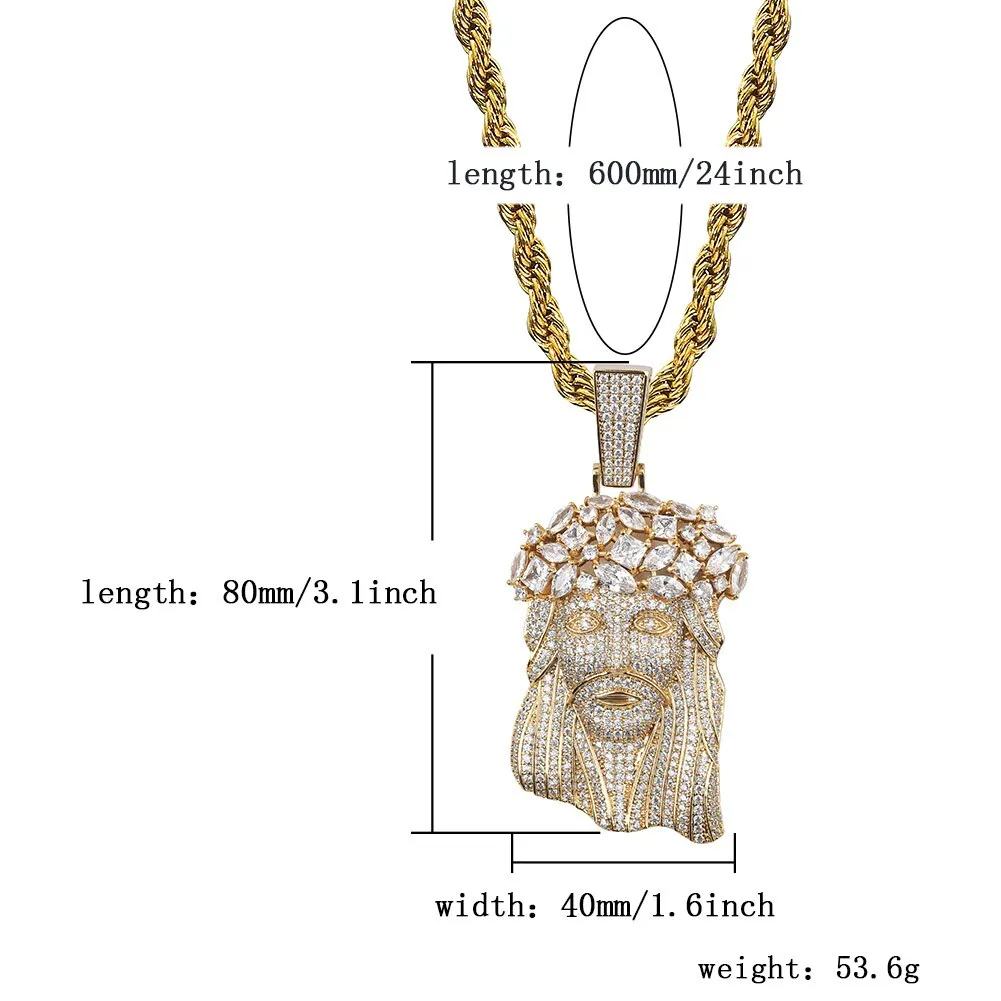Este collar presenta un llamativo colgante de Jesús, completamente incrustado con circonitas para un efecto radiante y llamativo. El colgante simboliza la fe, el amor y la devoción, lo que lo convierte no solo en un accesorio de moda, sino también en un preciado objeto espiritual. Su intrincado diseño y sus brillantes detalles lo convierten en una pieza destacada para cualquier creyente.