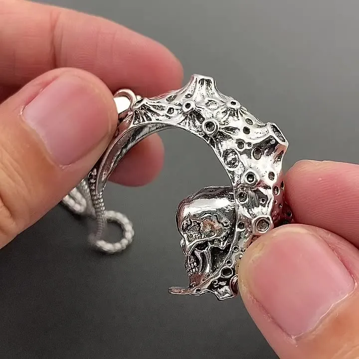 El colgante de calavera lunar 3D es la característica más destacada de este collar, con un potente toque punk y motero. La calavera está intrincadamente detallada con motivos lunares que añaden un aire de misterio y rebelión. Este llamativo diseño capta la atención y sirve como símbolo de fuerza, valentía y libertad. Ya seas motociclista, entusiasta del punk o simplemente alguien que disfruta de usar joyas únicas y vanguardistas, este colgante representa una actitud audaz y segura.