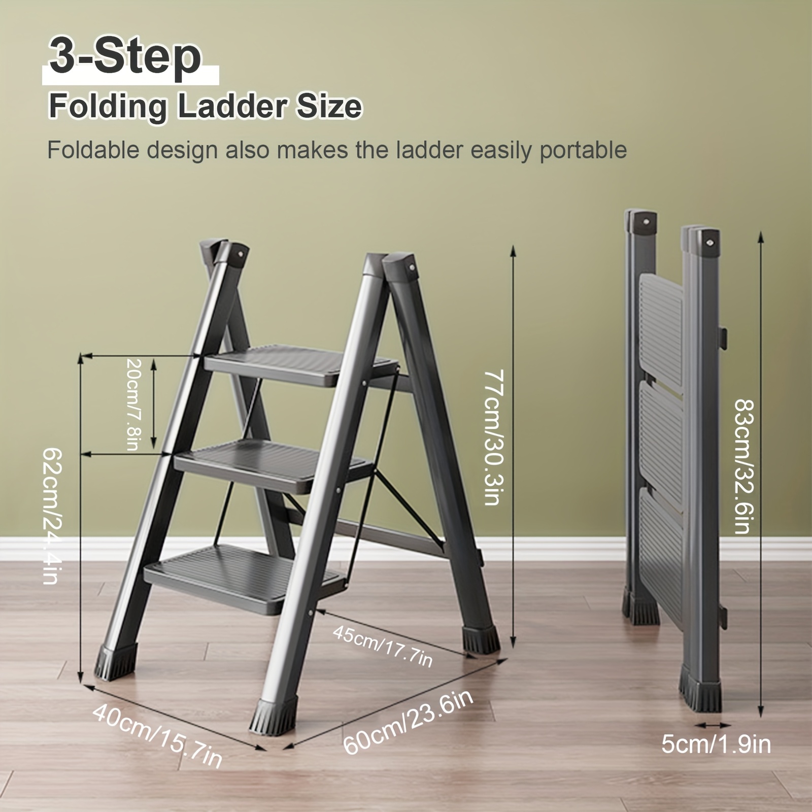 Collapsible Step Ladder with three steps, anti slip wide steps, lightweight carbon steel frame, foldable design, and versatile use for home and office