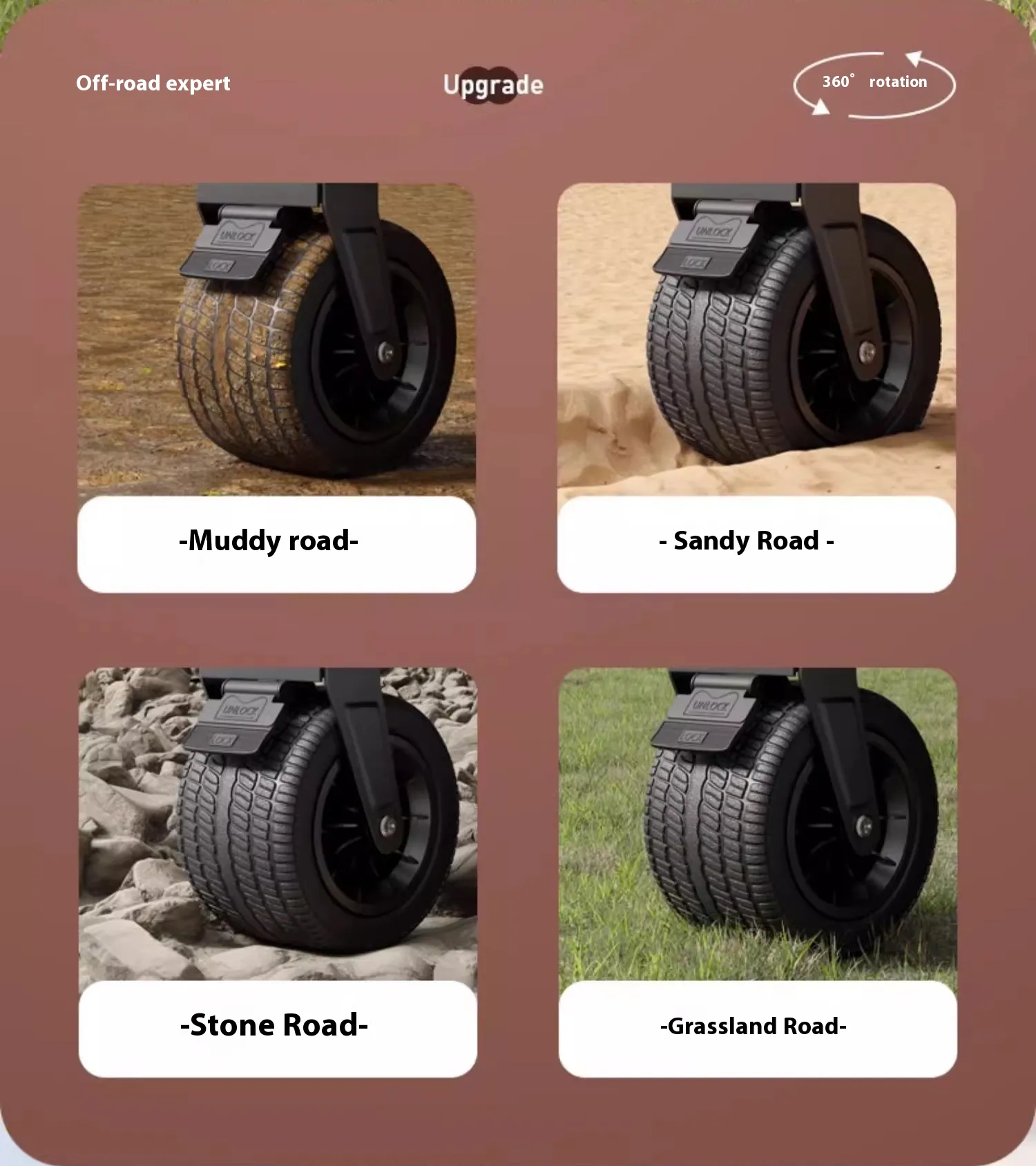 The all-terrain wheels and sturdy frame ensure reliable performance on sandy beaches, grassy parks, gravel paths, and even uneven trails.
