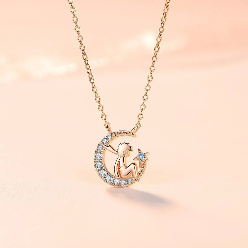 Collar con colgante de luna y principito, cadena de clavícula de lujo para mujer
