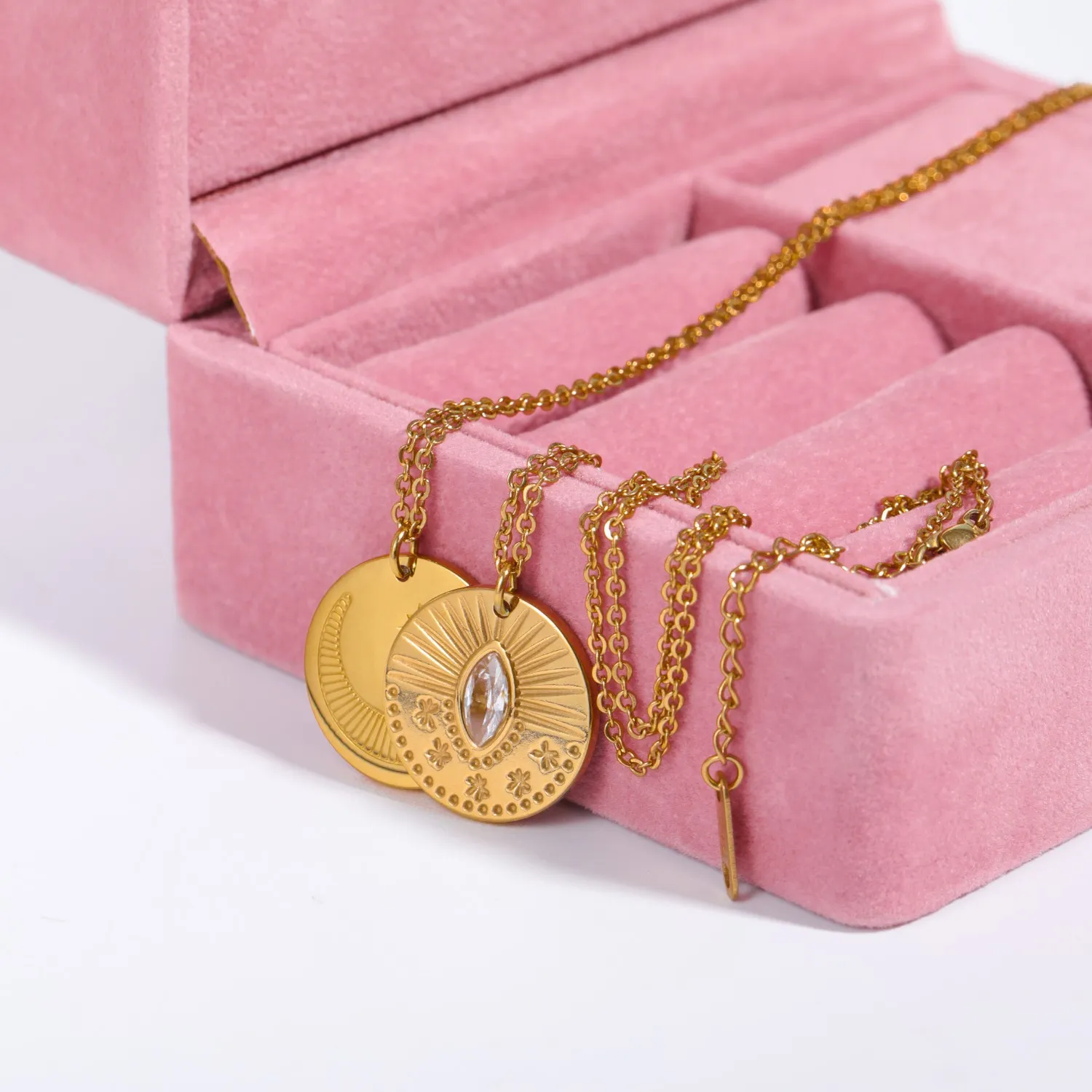 H1: Abraza la elegancia celestial con el collar tridimensional de monedas redondas Sol y Luna