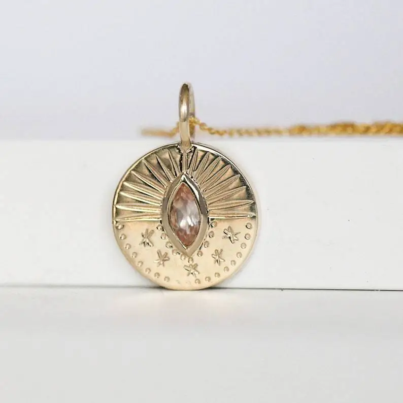 - Colgante de moneda redonda: Forma clásica realzada con intrincados patrones celestiales.