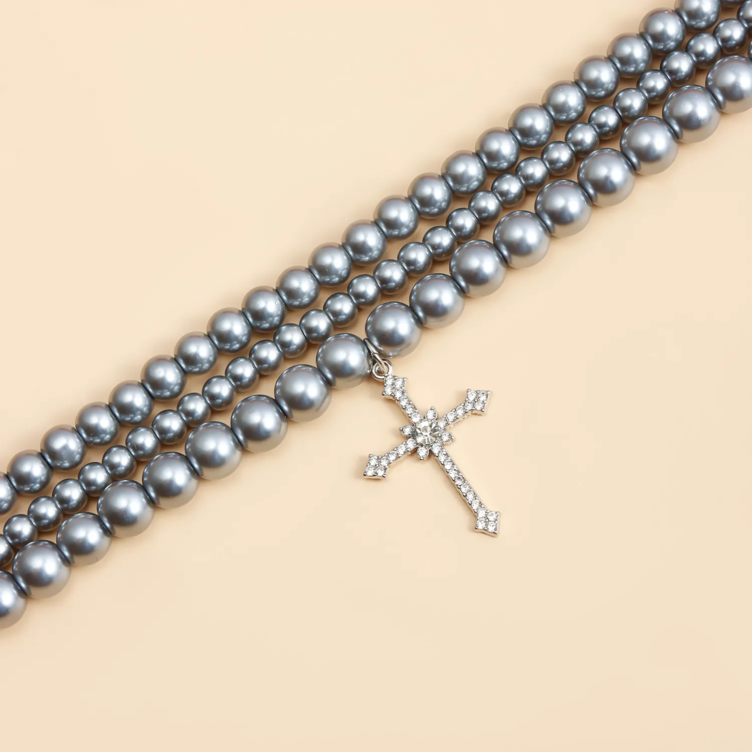 La construcción multicapa del collar incluye una cadena de clavícula, cuentas de vidrio pintadas y un impresionante colgante de cruz con incrustaciones de diamantes. Este efecto de capas crea profundidad y atractivo visual, convirtiéndolo en una pieza destacada para cualquier atuendo.