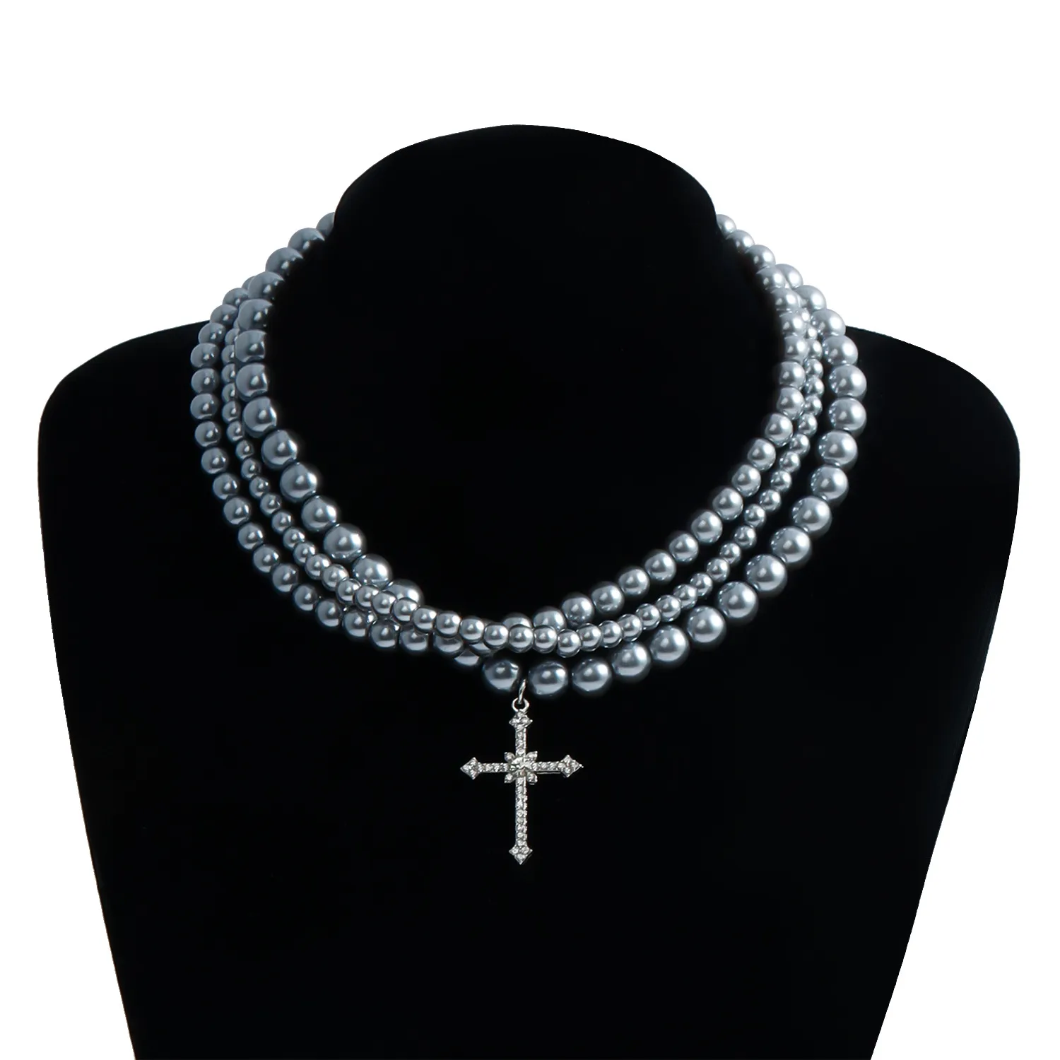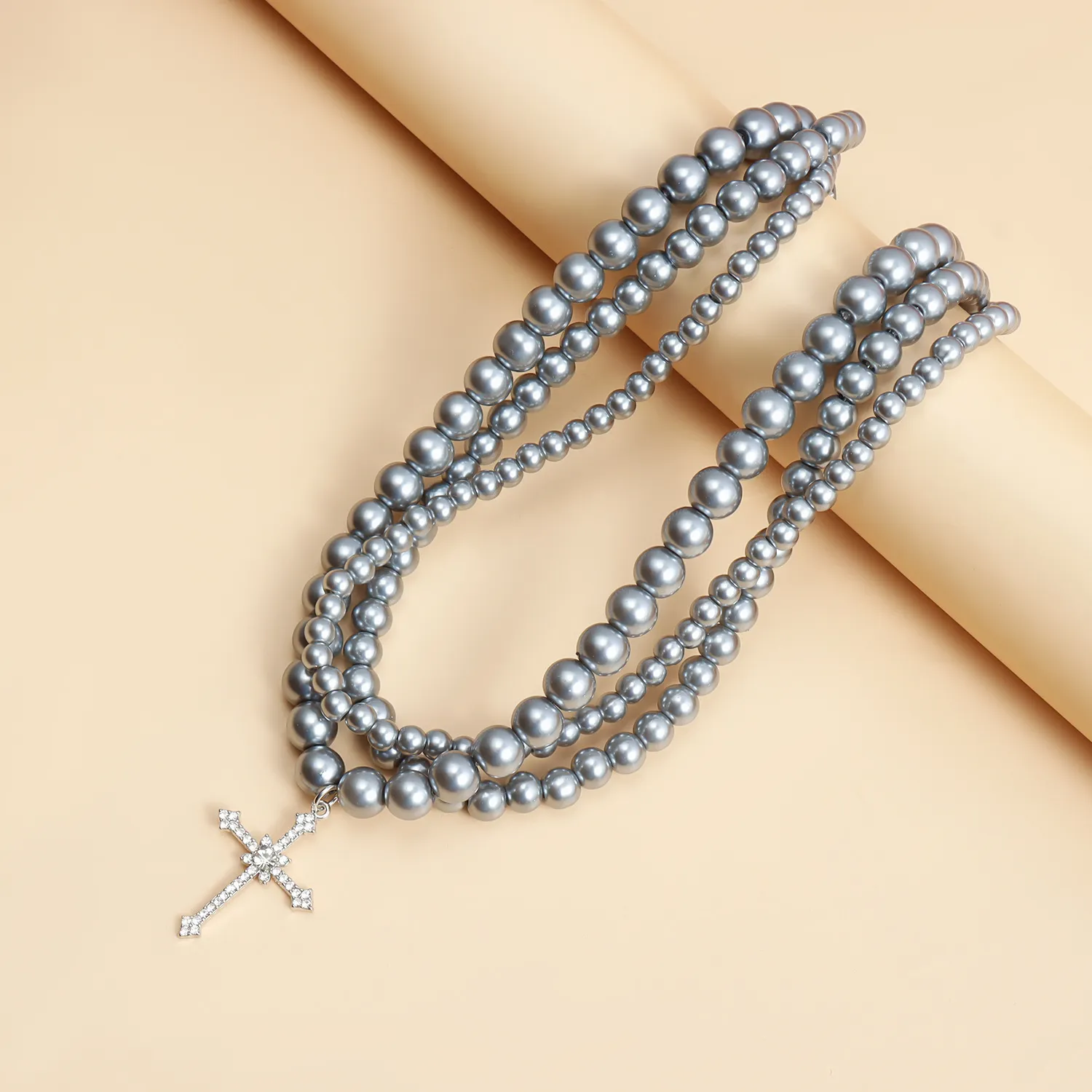 La construcción multicapa del collar incluye una cadena de clavícula, cuentas de vidrio pintadas y un impresionante colgante de cruz con incrustaciones de diamantes. Este efecto de capas crea profundidad y atractivo visual, convirtiéndolo en una pieza destacada para cualquier atuendo.