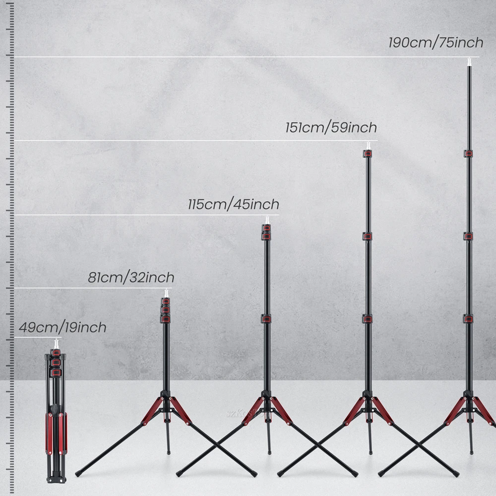 【Adjustable and Portable 】Feel free to adjust the height of the light stand from 28inch/72cm to 75inch/190cm; Its solid locking capabilities ensure the safety of your lighting equipment when in use.and the light stand can be Foldable, the Min. Foldable height is 19inch /49cm. the weight is only 0.77kg/1.7 lbs, which is very convenient to carry any where. Maximum support of 5kg weight support