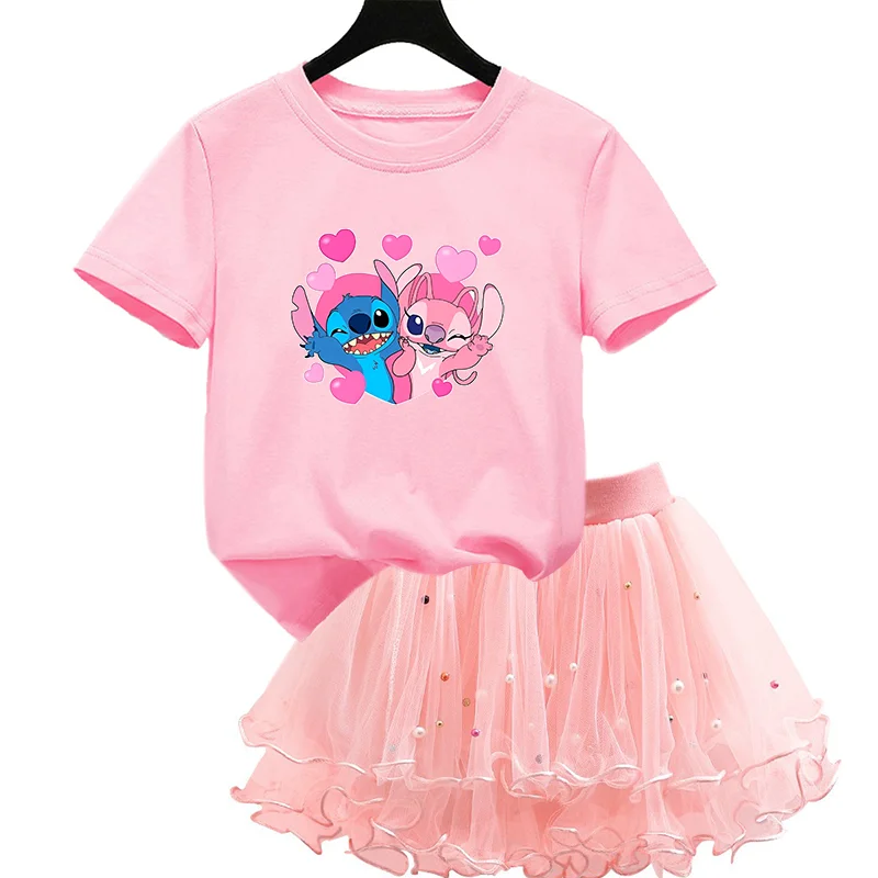 Color: army green, Kid Size: 2T - 2pcs Lilo Stitch Summer Girls Outfits Cartoon T-shirt and Tutu Skirt Princess Clothes Suit Children Birthday Clothing Sets