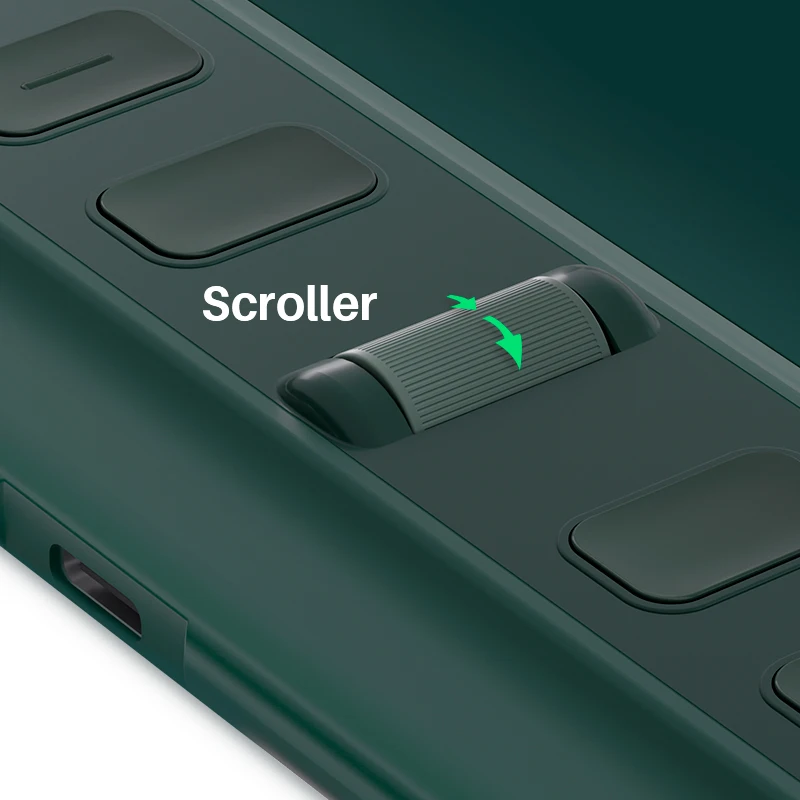 The press keys are much easier to navigate due to the bar height (2mm higher than the drawing surface), the color difference between the press keys and the bar, and the bumps on the press keys. Furthermore, Inspiroy 2 includes a very handy Scroller, sensitivity of whom can be adjusted in the driver, similar to a mouse scroll wheel.