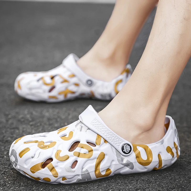 Color: army green, Shoe Size: 44 - Men Summer Slippers Thick Sole Mens Clogs Sandals Hollow Breathable Flip Flops Sandals Shoes Fashion Beach Slippers