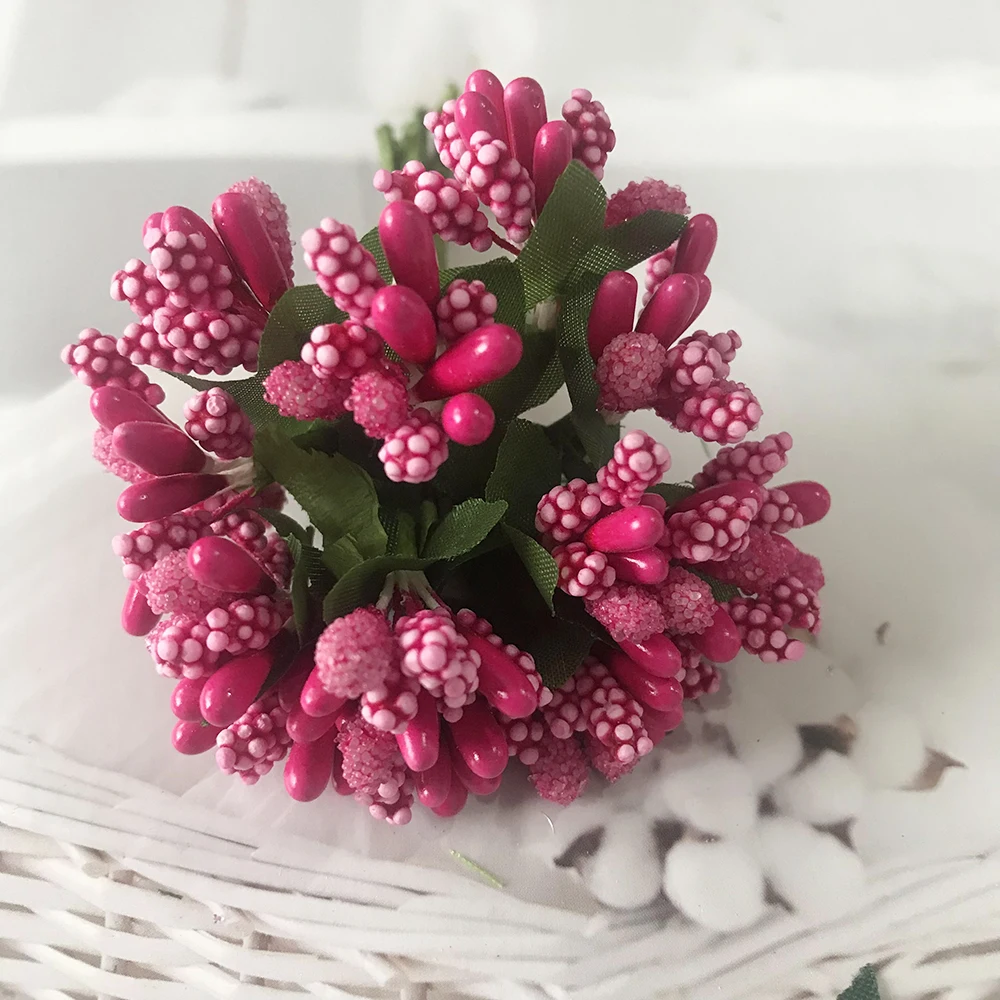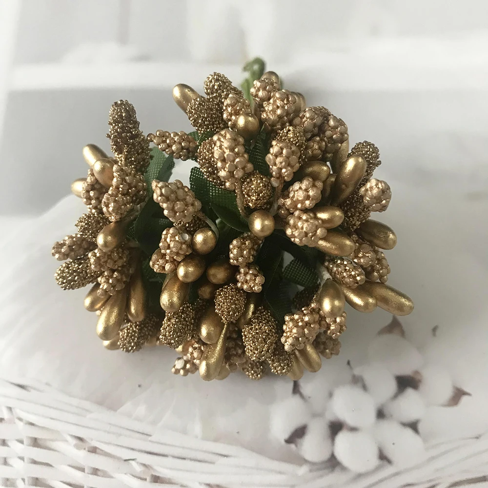 Color: Beige - 12PCS/lot Artificial Flower Small Berries Stamen Wire Stem/marriage Leaves DIY Wreath Wedding Scrapbooking Box Decoration Craft
