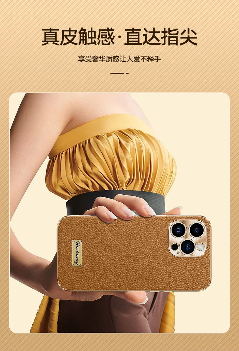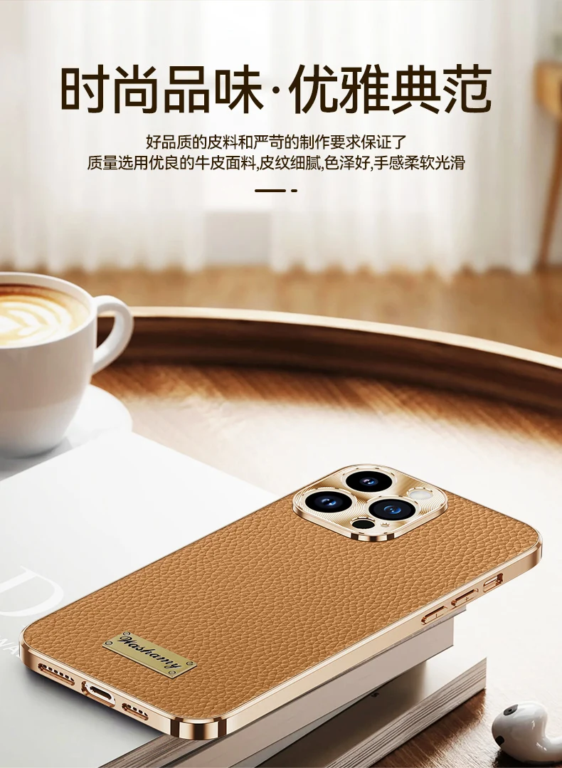 Color: Beige, Compatible-Phone Models: For iPhone 15 Pro Max - Luxury Genuine Leather Phone Case For iPhone 15 14 13 Pro Max Plating Soft Silicone Frame Shockproof Cover For iPhone 16 Pro Max