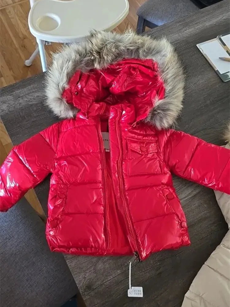 Color: Beige, Kid Size: 12 - Kids Winter Down Jacket Shiny Real Raccoon Fur Collar Toddler Boys Hooded Coat Baby Girls Warm Snowsuit Children's Parkas