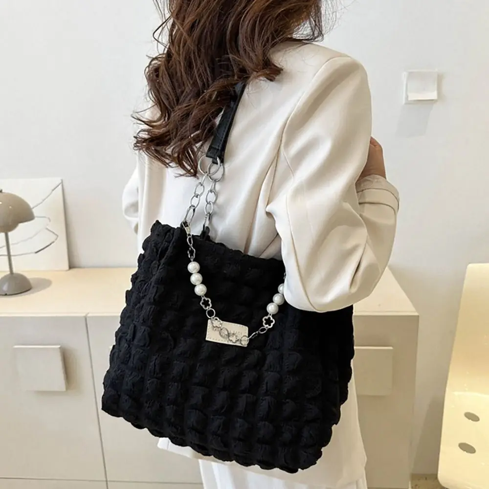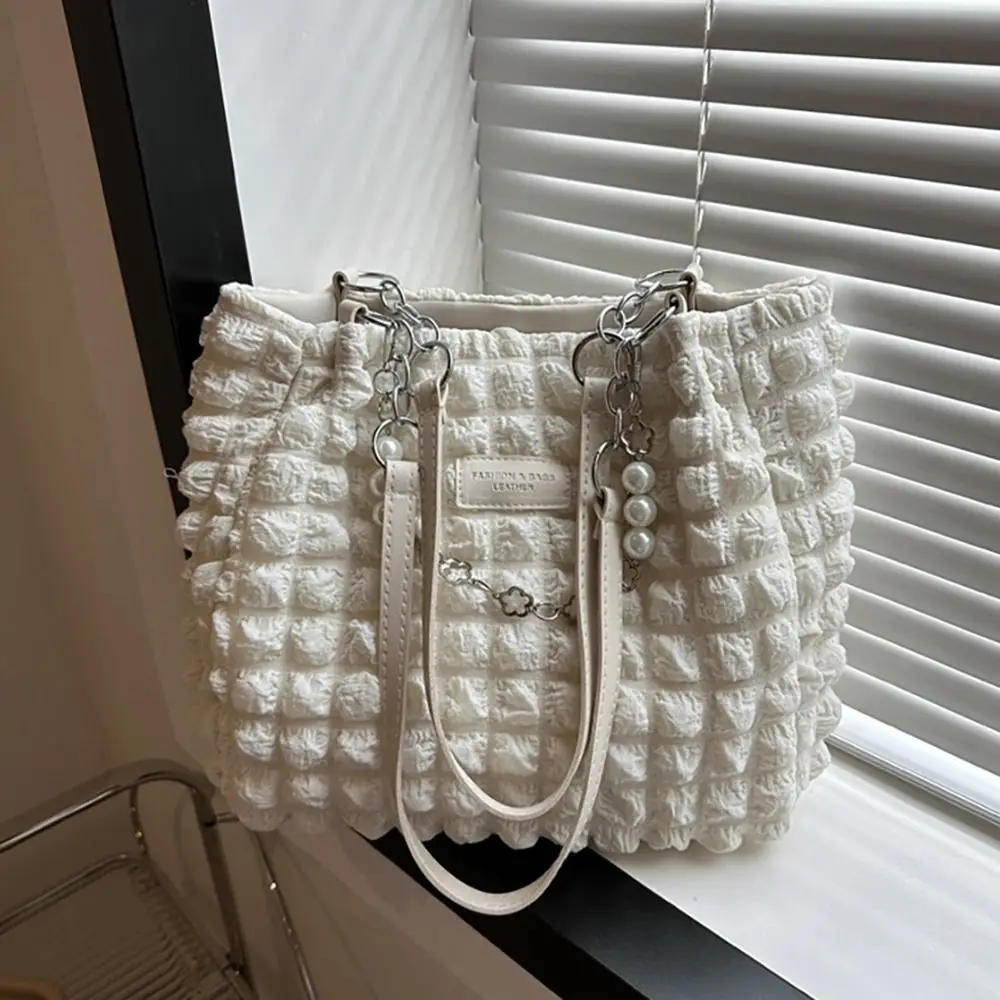Color: Beige - Large Capacity Ladies Tote Bag Fashion Plaid Women's Beaded Chain Shoulder Bags Soft Fabric Commuter Female Handbags Purse