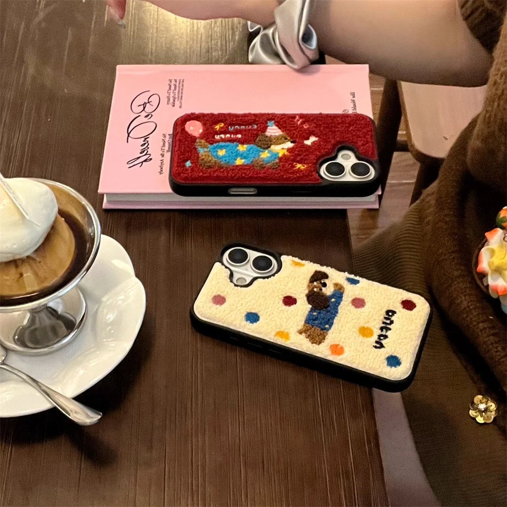 Color: Beige, Material: Acrylic - Luxury Cartoon Embroidery Cute Dog Cats Colorful Dots Phone Case For iPhone 13 14 15 16 Pro Max Plush Winter Shockproof Cover