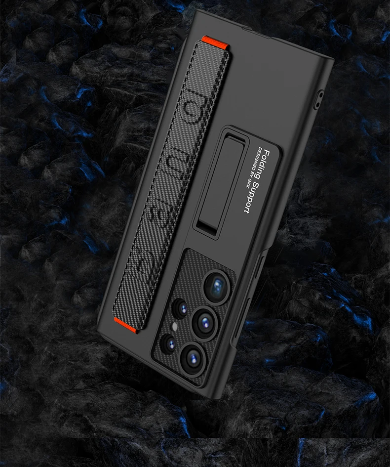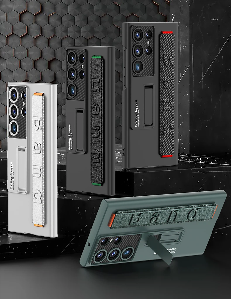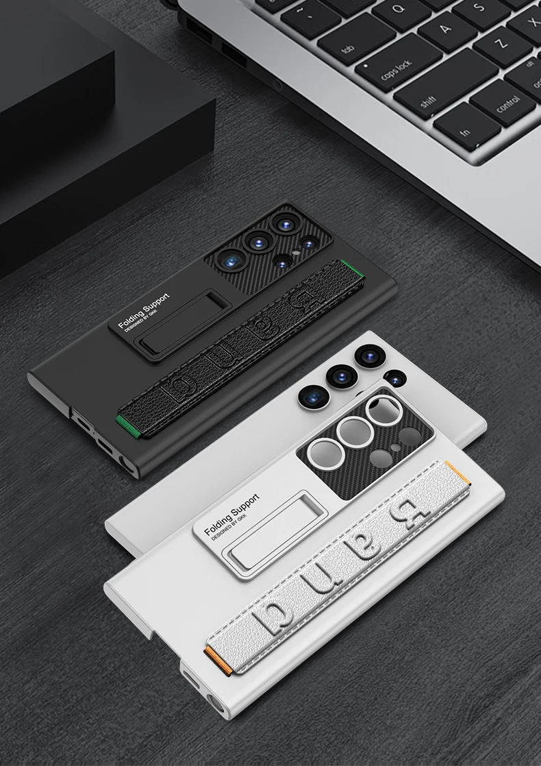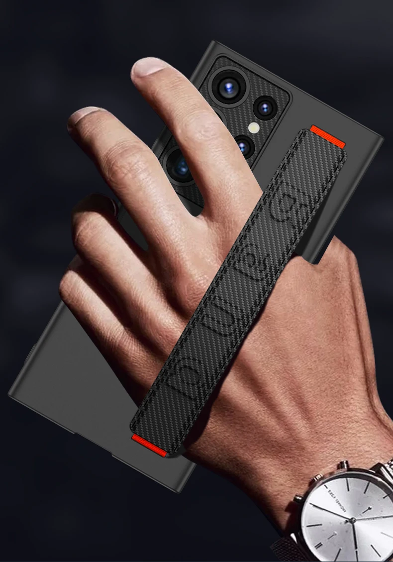 Color: Beige, Material: aluminum - S24 Ultra Wrist Strap Holder Case For Samsung Galaxy S23 Ultra Carbon Fiber Shockproof Armor Camera Protector Kickstand Cover