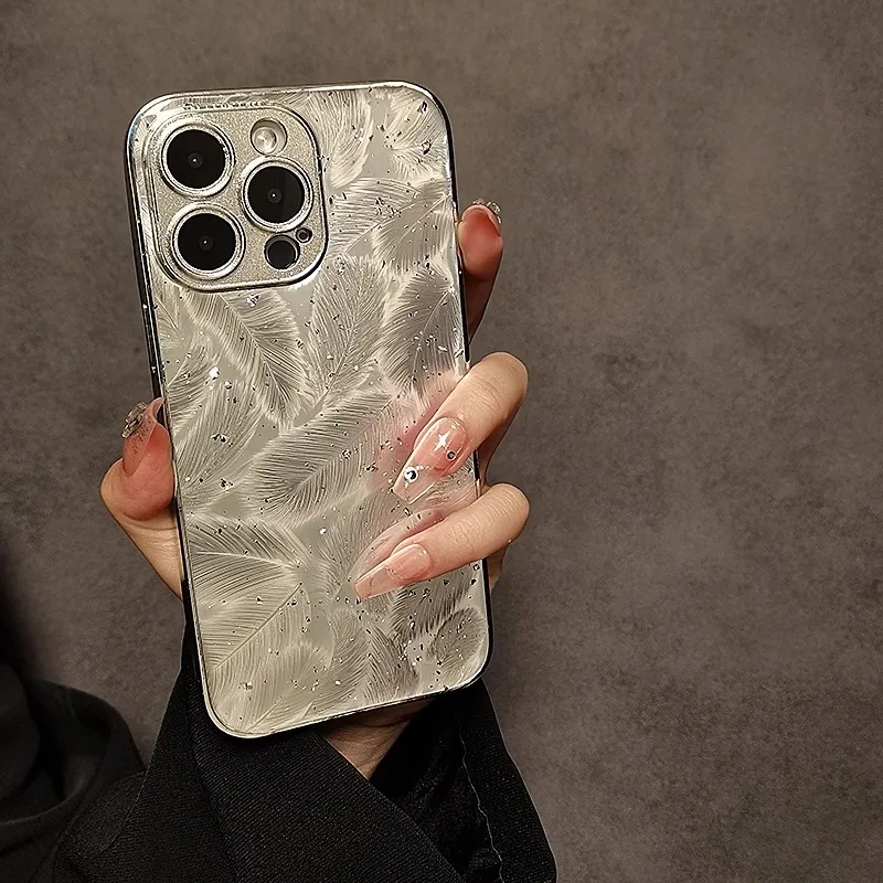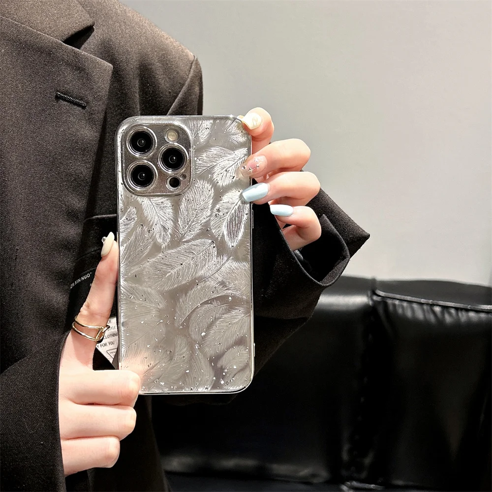 Luxury Plating Feather Phone Cover For iPhone 12 Pro 14 13 11 15 Pro Max Hard Anti-drop Lens Protection Case For iPhone 15 Plus
