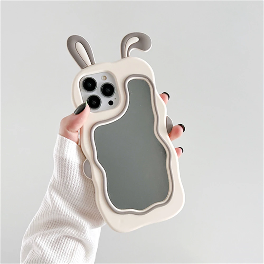 Color: Beige, Material: PE - Cute Bunny Ears Mirror Phone Case For iPhone 15 14 Plus 13 12 11 Pro Max Shockproof Silicone Case