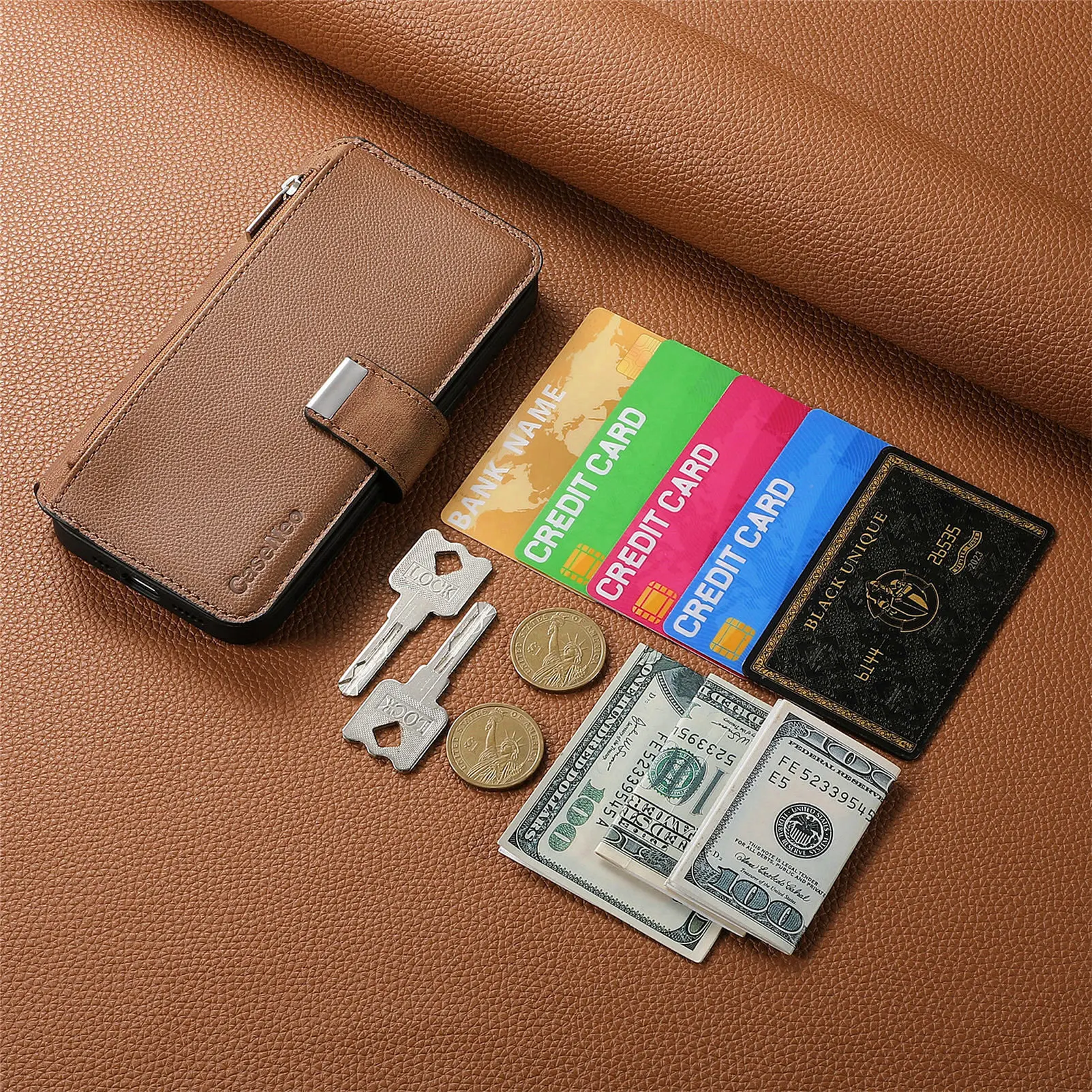 Feature 1: Zipper Wallet / flip case with 6 card slots + 1 cash slot+Zipper Pocket