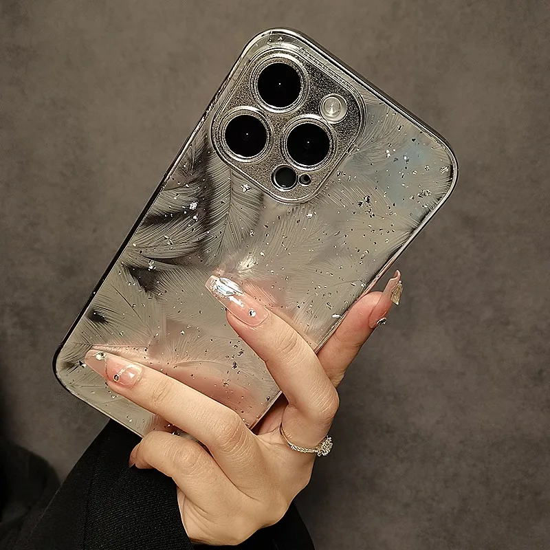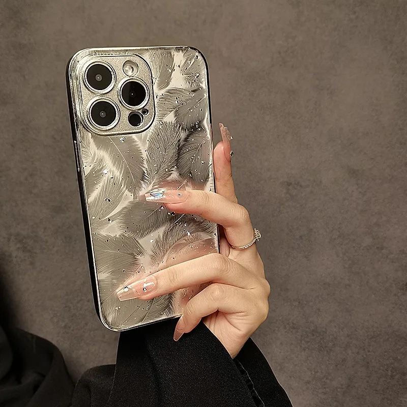 Luxury Plating Feather Phone Cover For iPhone 12 Pro 14 13 11 15 Pro Max Hard Anti-drop Lens Protection Case For iPhone 15 Plus