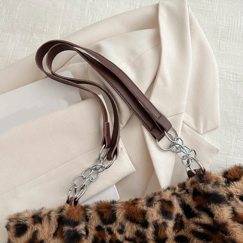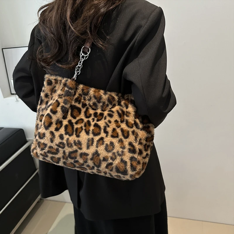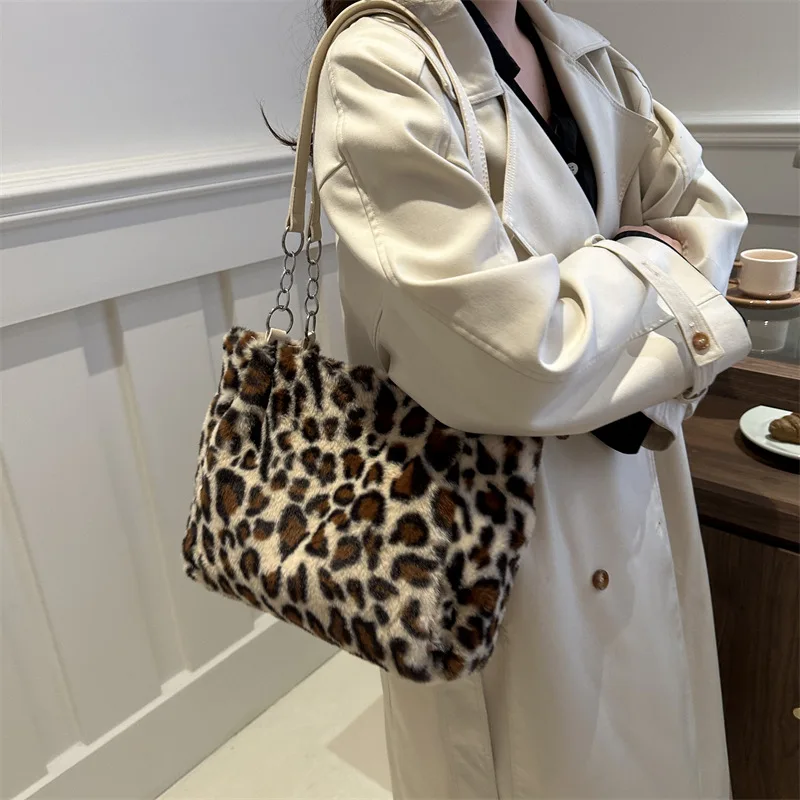 Color: Beige - National Style Simple Women Leopard Tote Bag Lady Luxury Fluffy Shoulder Bag Chain Large Capacity Commuter Handle Bag
