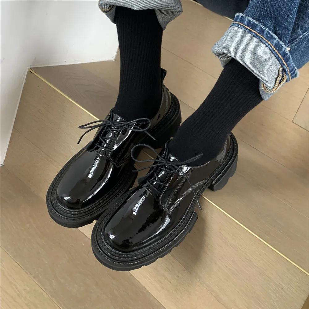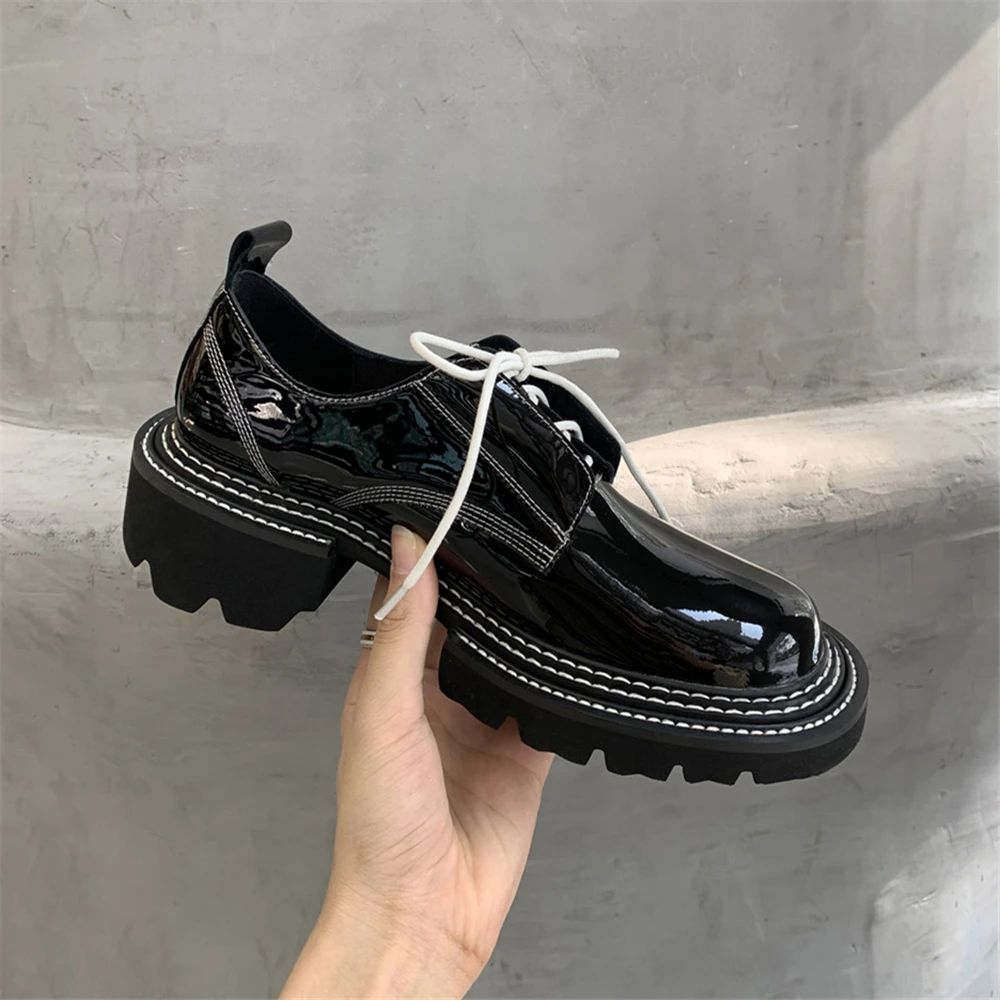 MILI-MIYA New Arrival Thick Heels Women Cow Patent Leather Pumps Lace Up Round Toe Fashion Street Casual Shoes Size 34-42 For Ladies