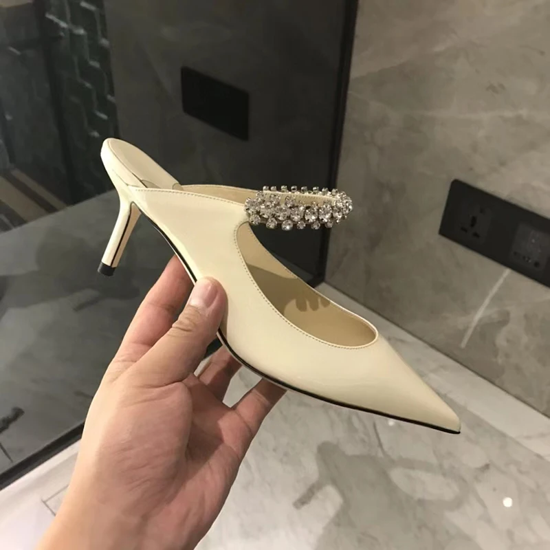 Color: Beige, Shoe Size: 41, Ships From: CHINA - Elegant Leather Mules Pointed Toe Stylish Rhinestone Embellished High Heel Sandals Sophisticated Party Evening Shoes Footwear