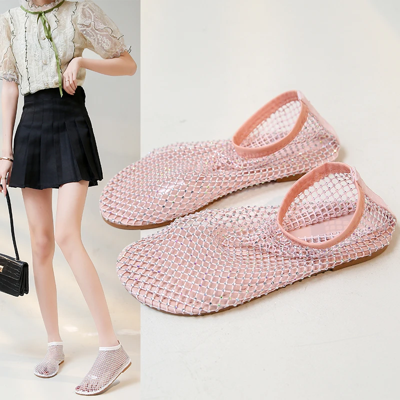Color: Beige, Shoe Size: 42 - Women Summer New Fashion Mesh Luxurious Rhinestone Designer Simple Solid Color Sandals Daily Versatile Round Toe Womens Sandal